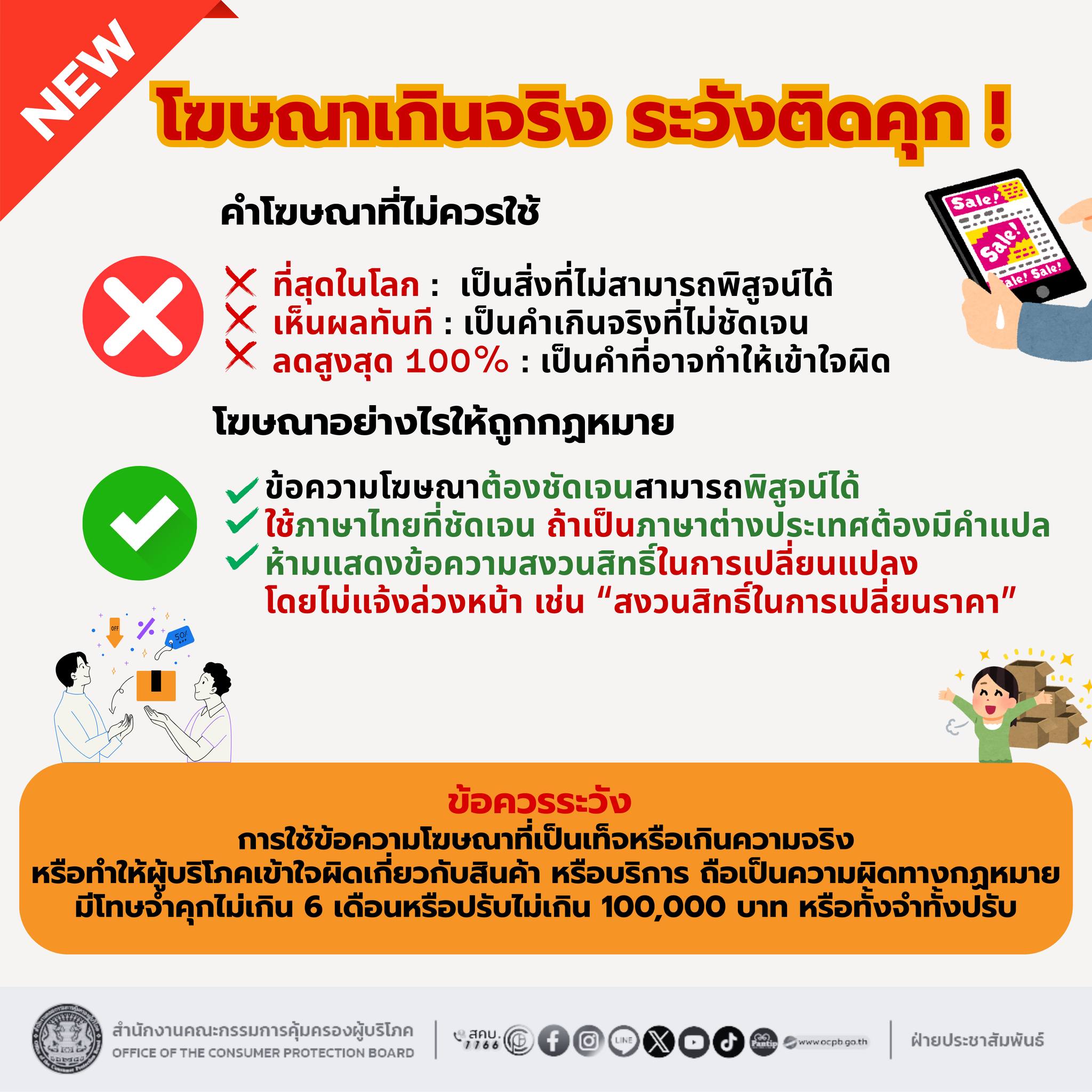 สำนักงานคณะกรรมการคุ้มครองผู้บริโภค แจ้งเตือนโฆษณาเกินจริง ระวังติดคุก
