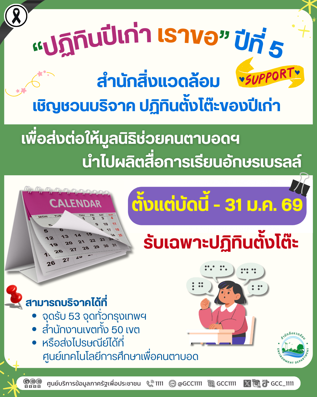 สำนักสิ่งแวดล้อม ขอชวนส่งปฏิทินตั้งโต๊ะของปีเก่า เพื่อส่งต่อให้กับมูลนิธิช่วยคนตาบอดแห่งประเทศไทยในพระบรมราชินูปถัมภ์ นำไปผลิตเป็นสื่อการเรียนการสอนอักษรเบรลล์สำหรับผู้พิการทางสายตา ในกิจกรรม “ปฏิทินปีเก่า เราขอ” (ปีที่ 5) โดยบริจาคได้ตั้งแต่บัดนี้ – 31 มกราคม 2569