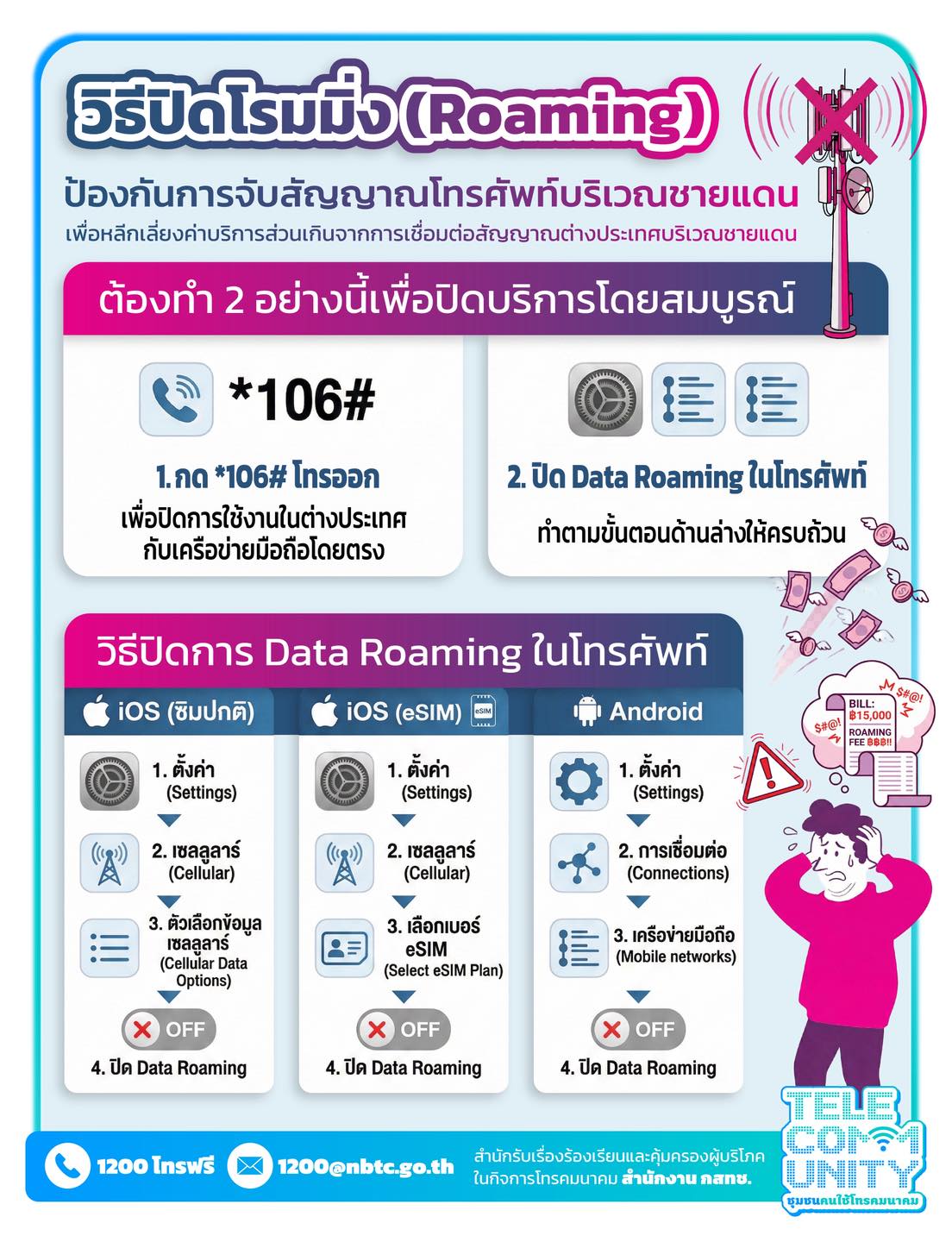 - ปิด Data Roaming ในโทรศัพท์ หรือหากได้รับความเดือดร้อนเสียหายในการใช้บริการโทรคมนาคม ก็สามารถร้องเรียนไปยัง สำนักงาน กสทช. ที่ 1200 (โทรฟรี) หรือ 1200@nbtc.go.th