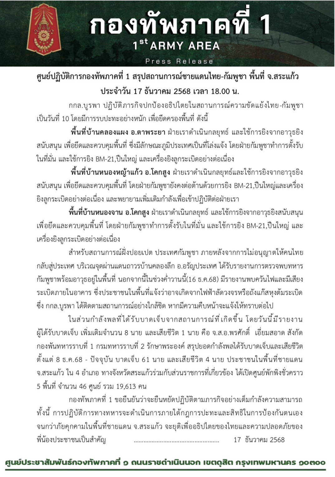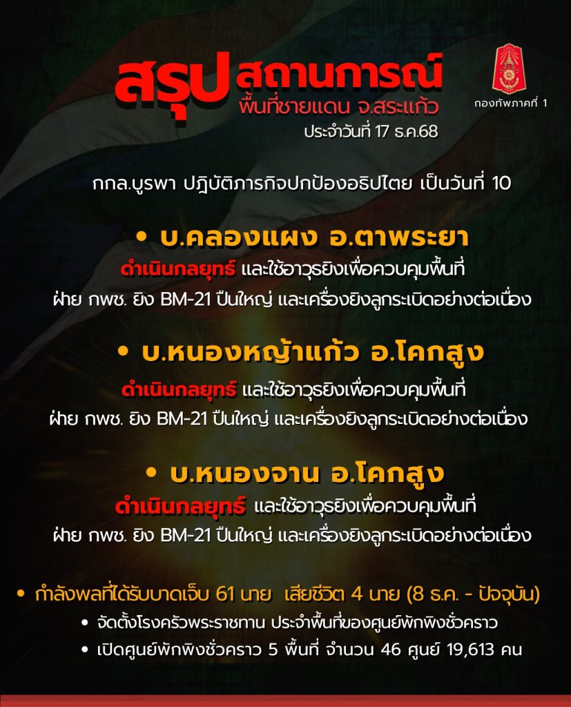 กองทัพภาคที่ 1 สรุปสถานการณ์ชายแดนไทย-กัมพูชา พื้นที่ จ.สระแก้ว ประจำวัน 17 ธันวาคม 2568 เวลา 18.00 น.