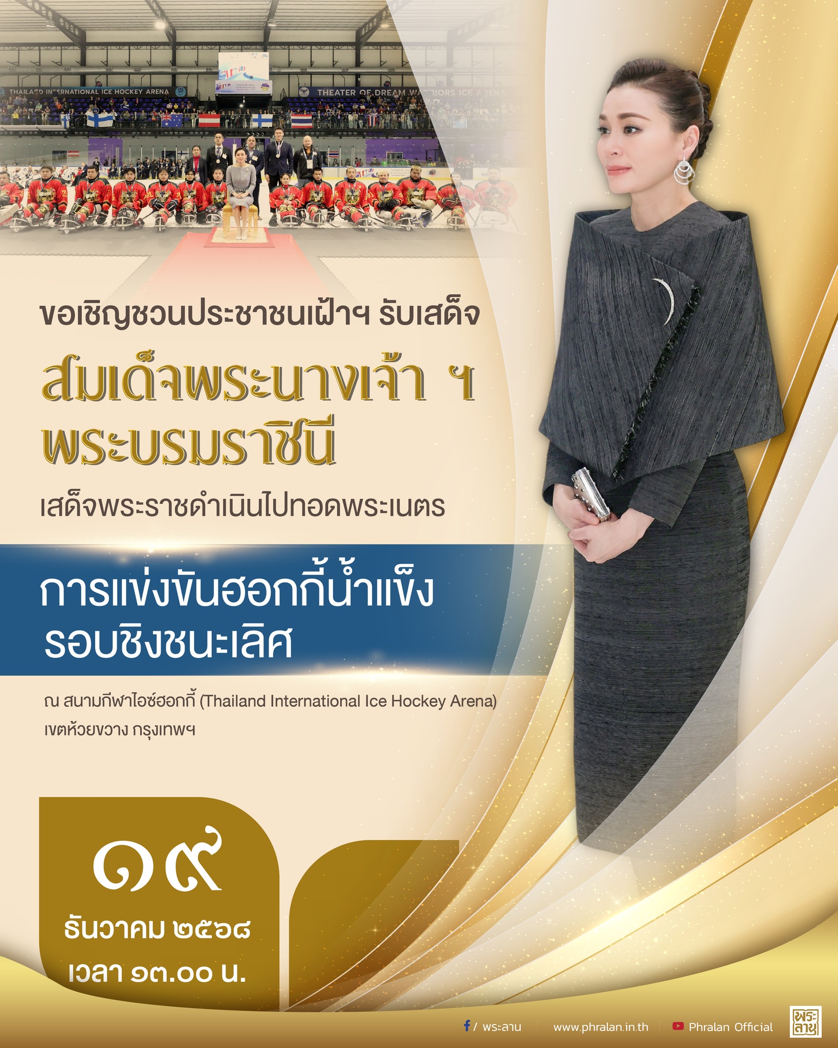 ขอเชิญชวนประชาชนเฝ้าฯ รับเสด็จ สมเด็จพระนางเจ้า ฯ พระบรมราชินี เสด็จพระราชดำเนินไปทอดพระเนตรการแข่งขันฮอกกี้น้ำแข็งรอบชิงชนะเลิศ ณ สนามกีฬาไอซ์ฮอกกี้ (Thailand International Ice Hockey Arena) เขตห้วยขวาง กรุงเทพฯ วันที่ 19 ธันวาคม 2568 เวลา 13.00 น.