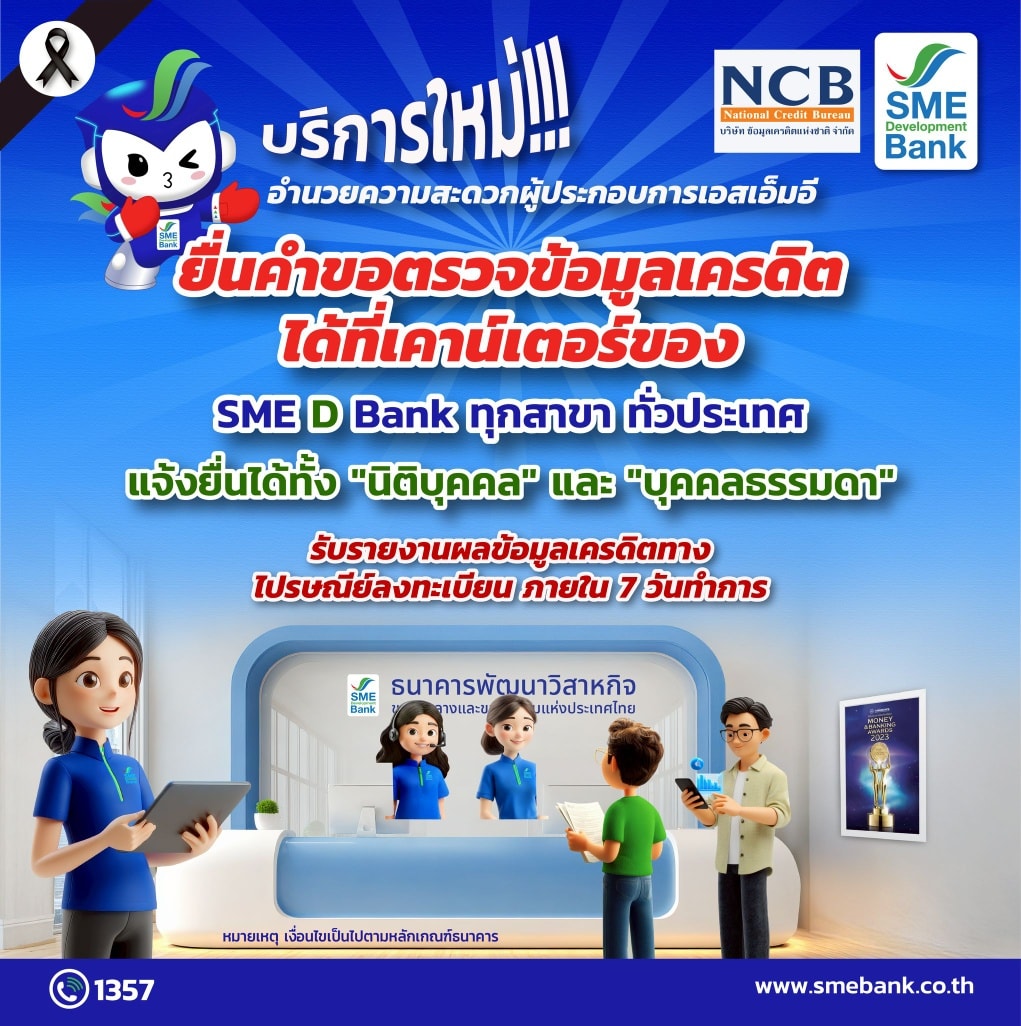 SME D Bank ร่วมกับ NCB เปิดบริการใหม่ อำนวยความสะดวก ยื่นคำขอตรวจข้อมูลเครดิตได้ที่เคาน์เตอร์ของ SME D Bank ทุกสาขา ทั่วประเทศ