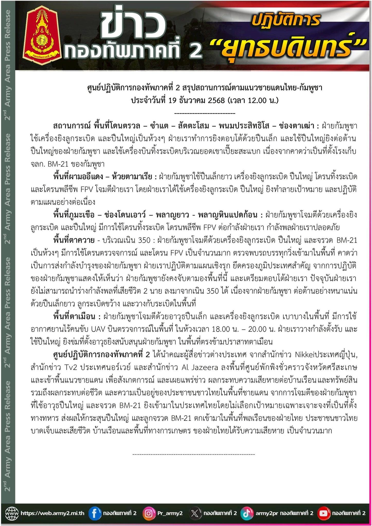 ศูนย์ปฏิบัติการกองทัพภาคที่ 2 สรุปสถานการณ์ตามแนวชายแดนไทย-กัมพูชา ประจำวันที่ 19 ธันวาคม 2568 (เวลา 12.00 น.)