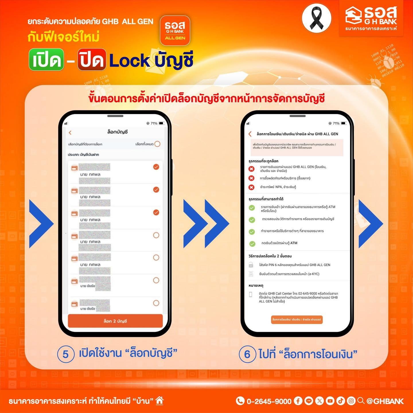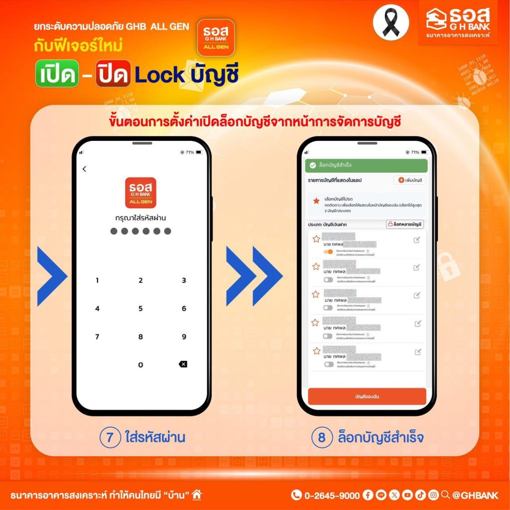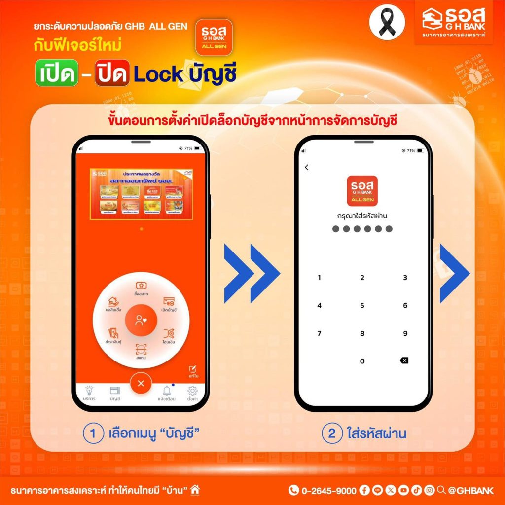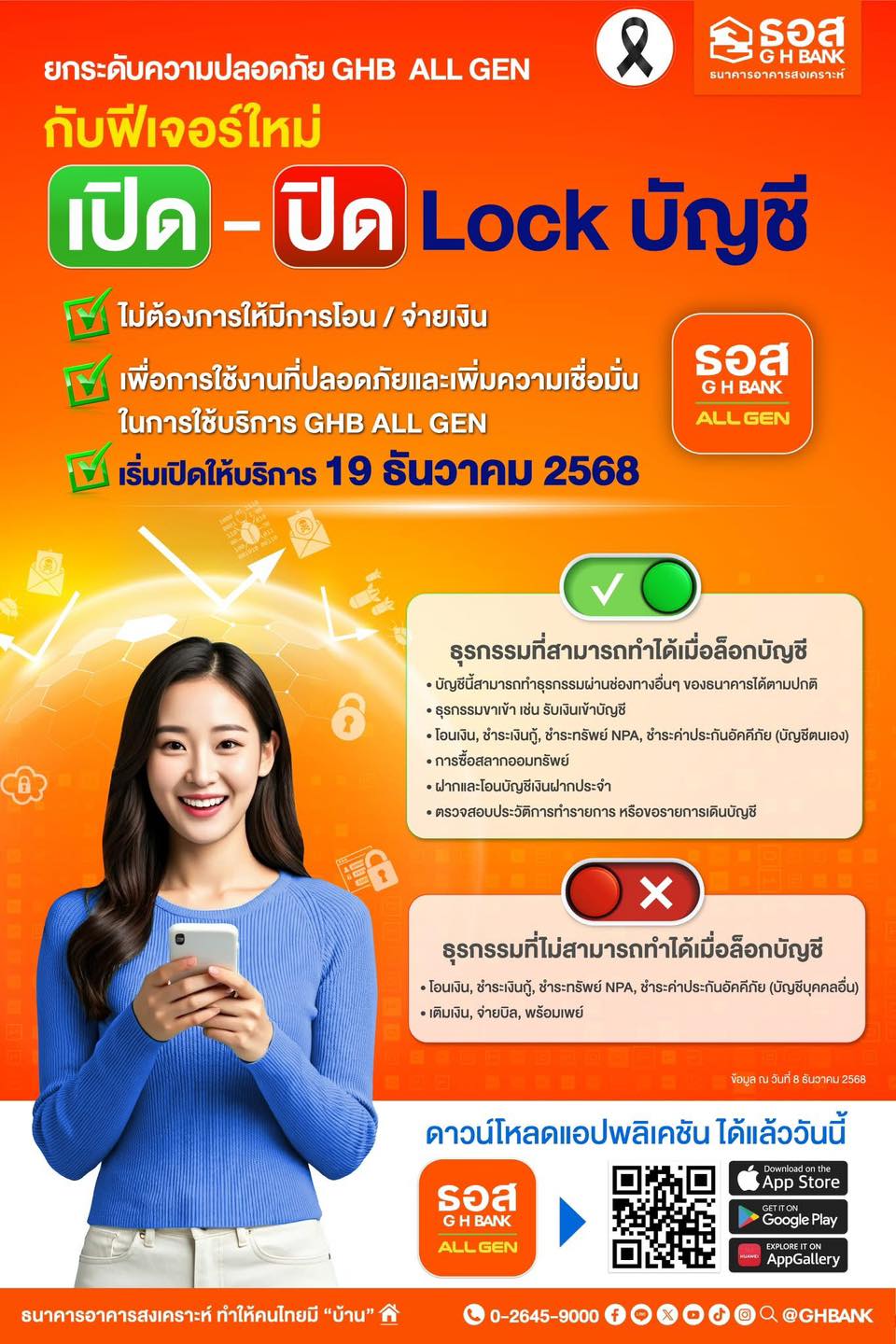 ธอส. เพิ่มฟังก์ชัน เปิด-ปิด ล็อกบัญชี ยกระดับความปลอดภัย ผ่าน Application : GHB ALL GEN ข่าวสารกิจกรรม ธอส. เพิ่มฟังก์ชัน เปิด-ปิด ล็อกบัญชี ยกระดับความปลอดภัย ผ่าน Application : GHB ALL GEN ธนาคารอาคารสงเคราะห์ (ธอส.) ยกระดับความปลอดภัยในการใช้บริการ Application : GHB ALL GEN เพิ่มฟังก์ชัน เปิด-ปิด ล็อกบัญชี เพื่อให้ลูกค้าสามารถควบคุมการทำธุรกรรมของบัญชีได้ด้วยตนเอง โดยสามารถล็อกการโอนเงิน เติมเงิน จ่ายบิล จ่ายพร้อมเพย์ ชำระเงินกู้ และชำระทรัพย์ NPA แต่ยังสามารถรับเงินเข้าบัญชีได้ตามปกติ เพื่อเพิ่มความเชื่อมั่นในการใช้บริการแอปพลิเคชันทางการเงินจาก ธอส. มากยิ่งขึ้น เมื่อลูกค้าต้องการทำธุรกรรม ลูกค้าสามารถทำการปลดล็อกบัญชีผ่านการยืนยันตัวตนด้วยการสแกนใบหน้า และรหัส PIN เพื่อกลับมาใช้งานได้ตามปกติ ลูกค้าที่ประสงค์ใช้งานฟังก์ชัน เปิด-ปิด ล็อกบัญชี สามารถดำเนินการได้ง่าย ๆ เพียงเข้า Application : GHB ALL GEN และอัปเดตเพื่อให้สามารถรองรับการใช้งานฟังก์ชัน เปิด-ปิด ล็อกบัญชี ได้ตั้งแต่วันที่ 19 ธันวาคม 2568 เป็นต้นไป สอบถามรายละเอียดเพิ่มเติมได้ที่ GH Bank Call Center โทร 0 2645 9000 และติดตามข่าวสารของธนาคารได้ที่ G H Bank Social Media ทุกช่องทาง ที่มา :Facebook ธนาคารอาคารสงเคราะห์Website ธนาคารอาคารสงเคราะห์Facebook ธนาคารอาคารสงเคราะห์ Post Views: 11 FacebookFacebookXTwitterLINELine
