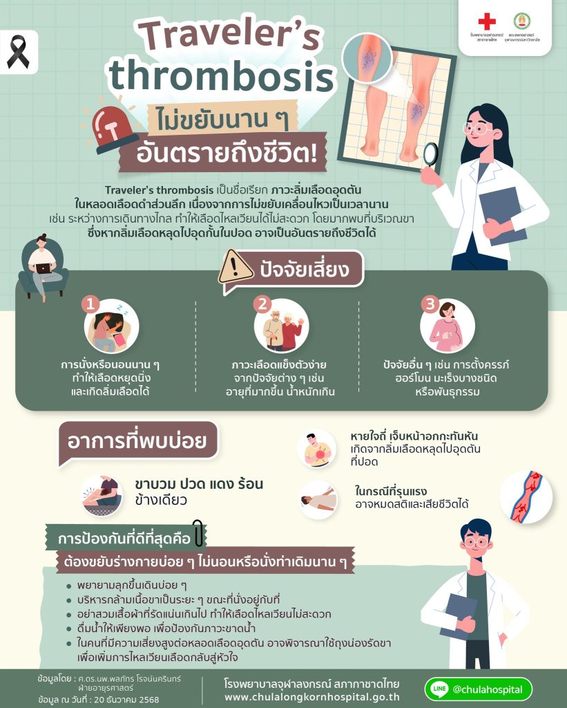 Traveler’s thrombosis เป็นชื่อเรียก ภาวะลิ่มเลือดอุดตันในหลอดเลือดดำส่วนลึก เนื่องจากการไม่ขยับเคลื่อนไหวเป็นเวลานาน เช่น ระหว่างการเดินทางไกล ทำให้เลือดไหลเวียนได้ไม่สะดวก โดยมากพบที่บริเวณขา ซึ่งหากลิ่มเลือดหลุดไปอุดกั้นในปอด อาจเป็นอันตรายถึงชีวิตได้