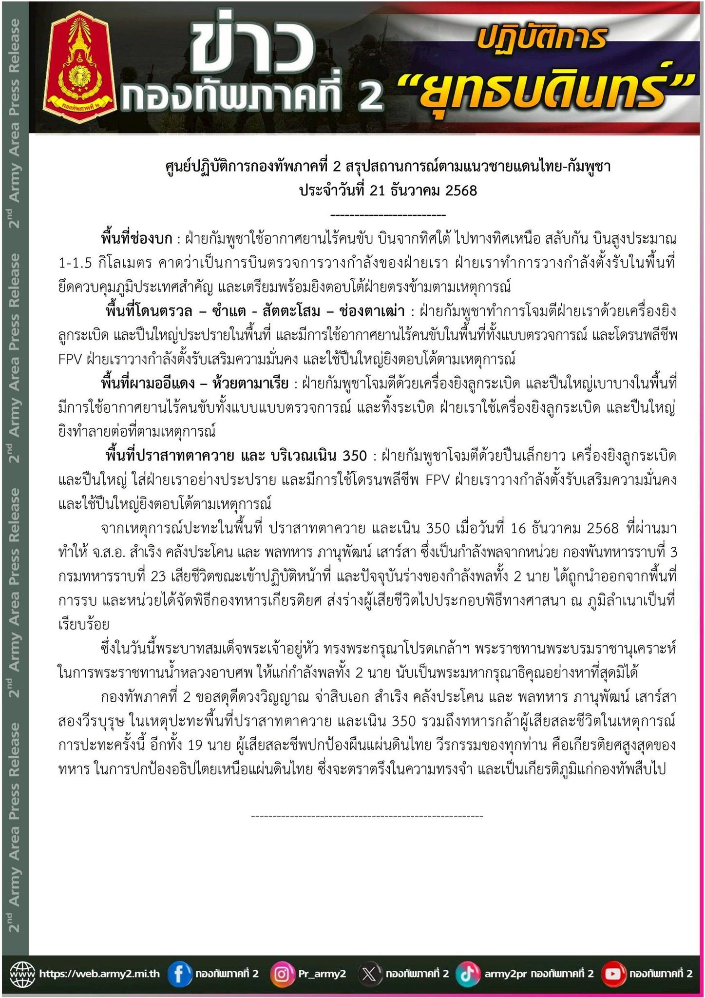 ศูนย์ปฏิบัติการกองทัพภาคที่ 2 สรุปสถานการณ์ตามแนวชายแดนไทย-กัมพูชา ประจำวันที่ 21 ธันวาคม 2568