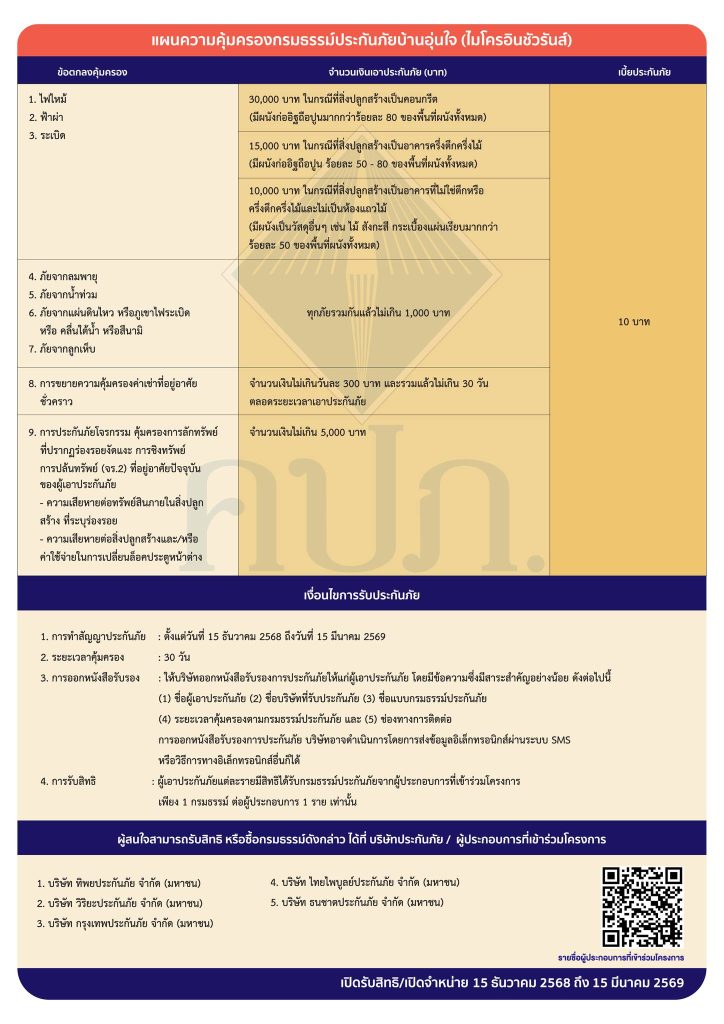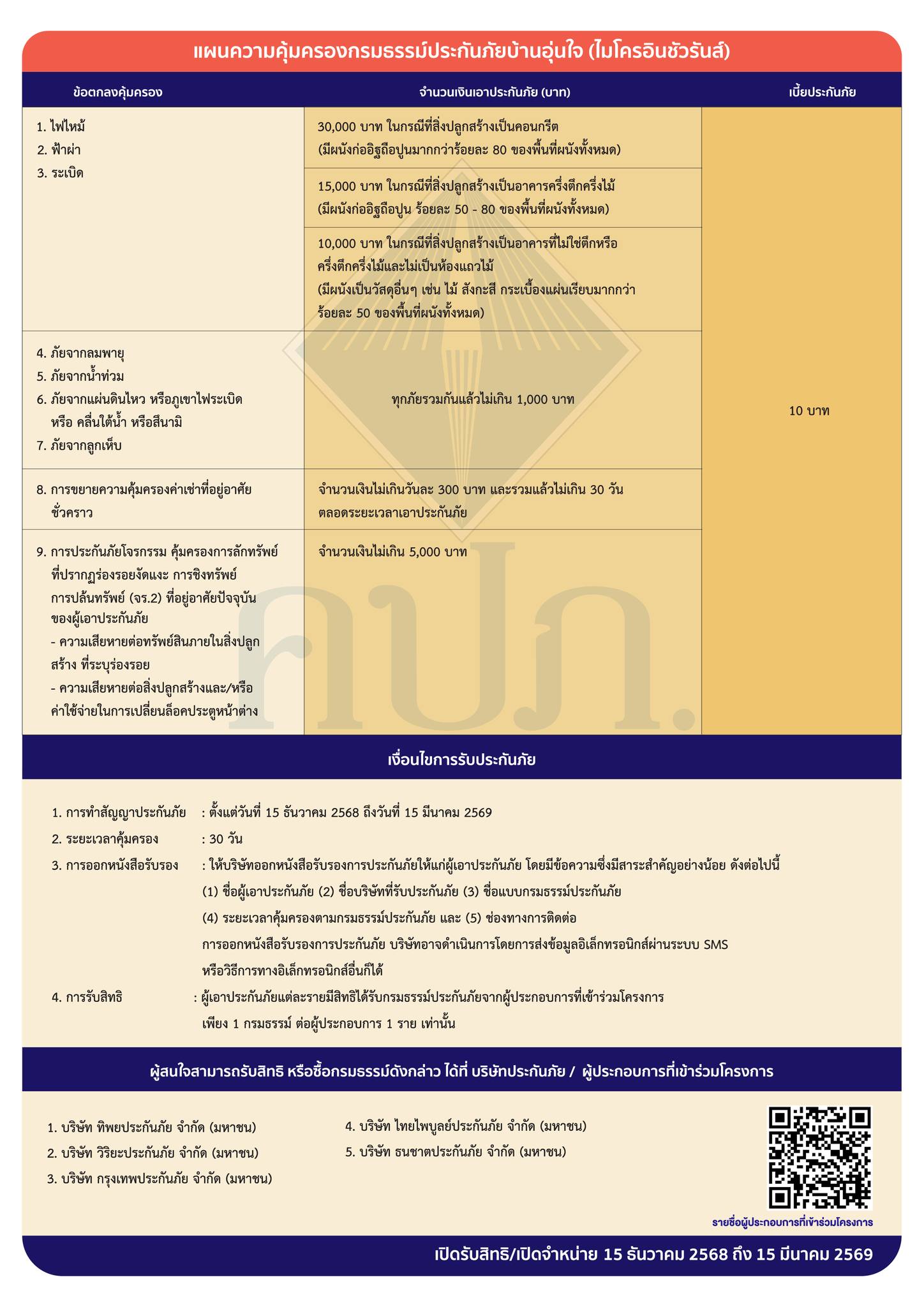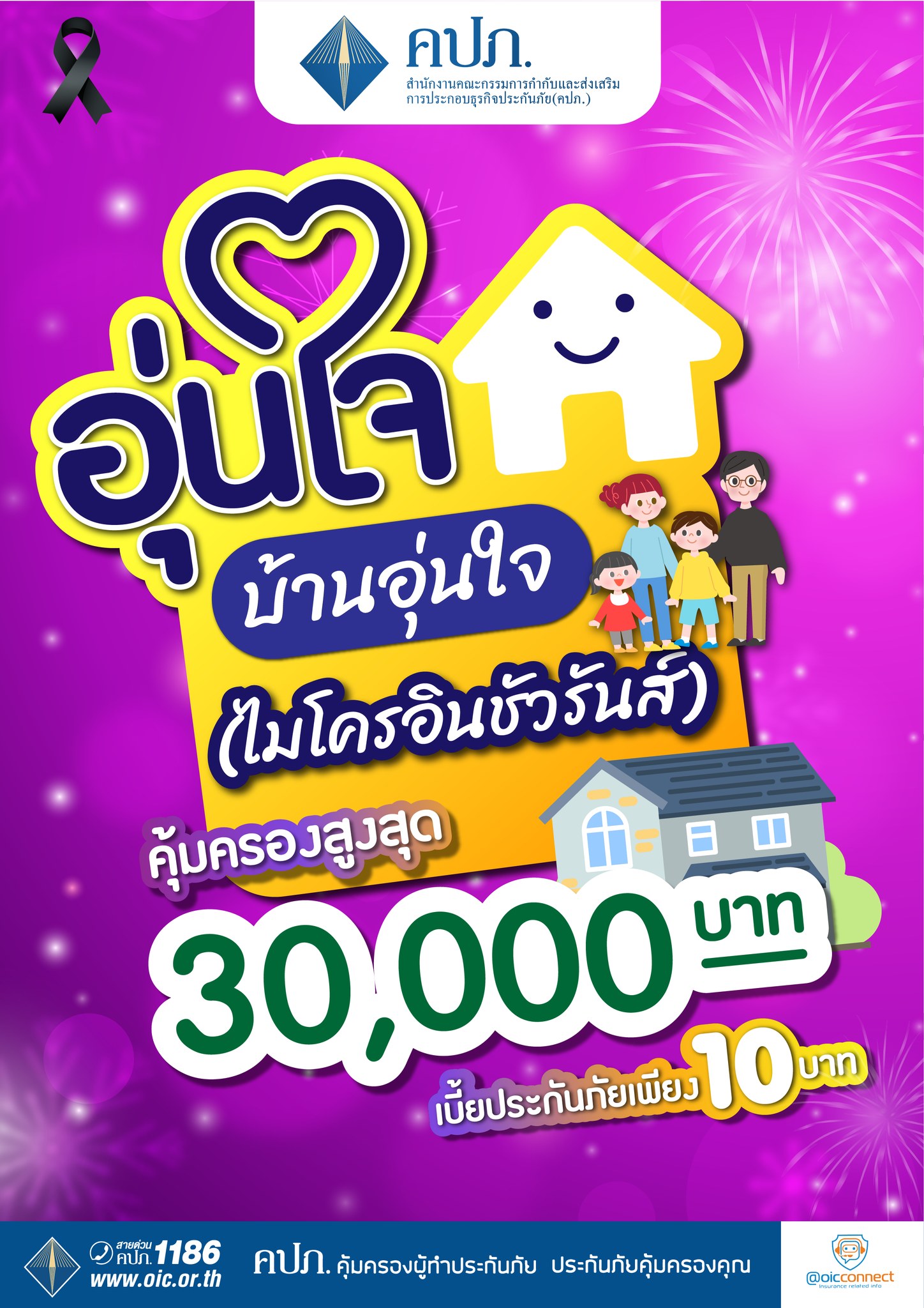 นอกจากนี้ คปภ. ยังได้จัดให้มี กรมธรรม์ประกันภัยบ้านอุ่นใจ ฉบับละ 10 บาท เพื่อดูแลทรัพย์สินที่อยู่อาศัยของประชาชน ให้ความคุ้มครองความเสียหายจากอัคคีภัย ภัยธรรมชาติ และการลักทรัพย์ วงเงินความคุ้มครองสูงสุด 30,000 บาท