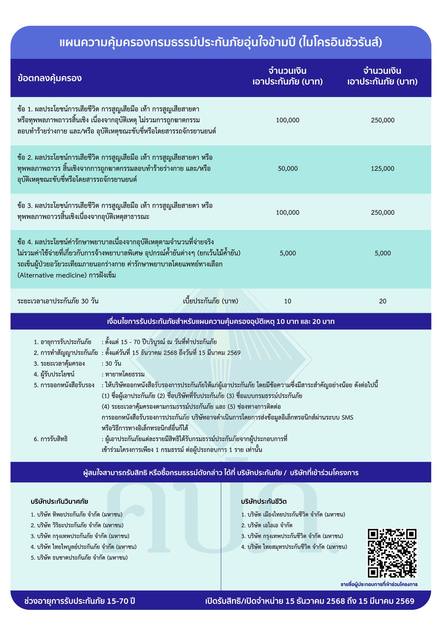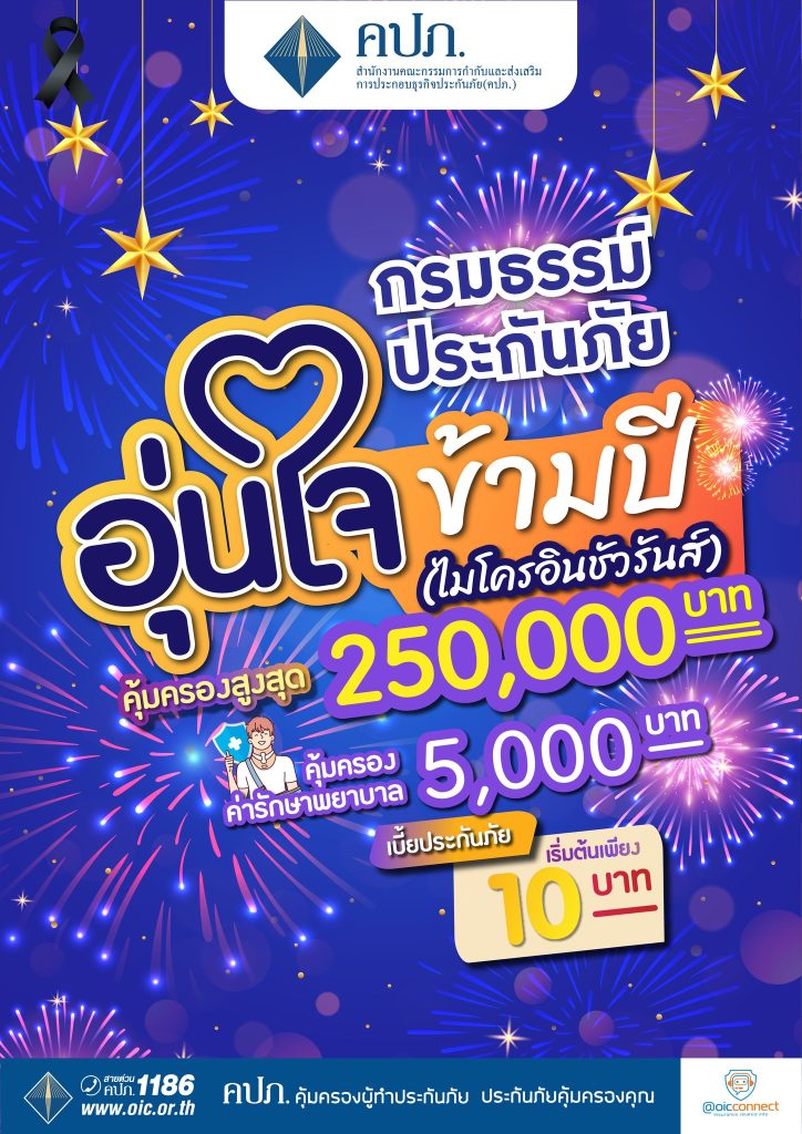 ขณะเดียวกัน คปภ. ยังคงจำหน่าย กรมธรรม์ประกันภัยอุ่นใจข้ามปี ฉบับละ 10 บาท ซึ่งเป็นแผนดั้งเดิม เหมาะสำหรับประชาชนที่ต้องการความคุ้มครองพื้นฐาน โดยให้ความคุ้มครองกรณีเสียชีวิตจากอุบัติเหตุสูงสุด 100,000 บาท และค่ารักษาพยาบาลจากอุบัติเหตุ 5,000 บาท