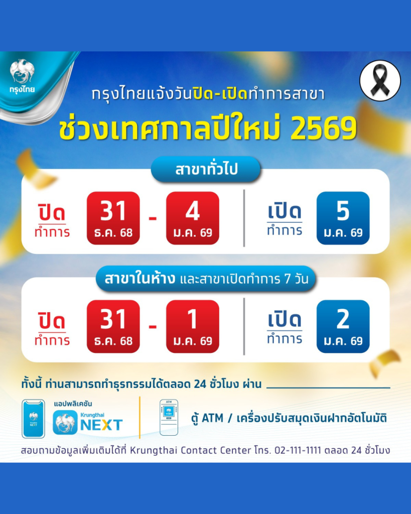 ธนาคารกรุงไทย แจ้ง วันปิด – เปิดทำการสาขา ช่วงเทศกาลปีใหม่ 2569 ดังนี้