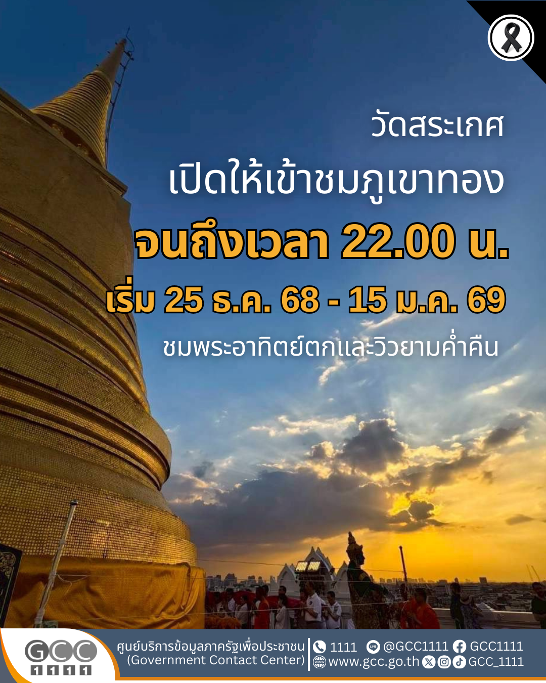 วัดสระเกศ เปิดภูเขาทองถึง 22.00 น. ชวนชมพระอาทิตย์ตกและวิวยามค่ำ 25 ธ.ค. 68 – 15 ม.ค. 69 ข่าวสารกิจกรรม, ปีใหม่ วัดสระเกศ เปิดภูเขาทองถึง 22.00 น. ชวนชมพระอาทิตย์ตกและวิวยามค่ำ 25 ธ.ค. 68 – 15 ม.ค. 69 วัดสระเกศราชวรมหาวิหาร ประกาศขยายเวลาเปิดให้เข้าชมภูเขาทองจนถึงเวลา 22.00 น. ตั้งแต่วันที่ 25 ธันวาคม 2568 – 15 มกราคม 2569 เพื่อให้นักท่องเที่ยวได้ชมความงดงามของพระอาทิตย์ตกดินและทิวทัศน์กรุงเทพมหานครยามค่ำคืน วัดสระเกศ เปิดภูเขาทองถึง 4 ทุ่ม (22.00 น.) ตั้งแต่วันที่ 25 ธันวาคม 2568 ถึง 15 มกราคม 2569 ให้นักท่องเที่ยวชมพระอาทิตย์ตกดิน และชมความงามยามค่ำคืนของกรุงเทพมหานคร ภูเขาทองได้รับการยกย่องจากนักท่องเที่ยวชาวต่างชาติว่าเป็นจุดที่ดีที่สุดในการชมความงามของพระอาทิตย์ตกดิน และความงามยามค่ำคืนของกรุงเทพมหานคร ดังนั้น ในช่วงเทศกาลปีใหม่ 2569 วัดสระเกศ เปิดภูเขาทองเพื่อให้นักท่องเที่ยวชมความงามพระอาทิตย์ตกดิน และชมความงามของกรุงเทพมหานครยามค่ำคืน จนถึงเวลา 22.00 น. ตั้งแต่วันที่ 25 ธันวาคม 2568 ถึง 15 มกราคม 2569สอบถามเพิ่มเติมได้ที่ สำนักงานเลขานุการวัดสระเกศโทร. 06 2346 5632โทร. 08 4635 1452โทร. 08 2959 9359 ที่มา : Facebook วัดสระเกศราชวรมหาวิหาร Post Views: 169 FacebookFacebookXTwitterLINELine