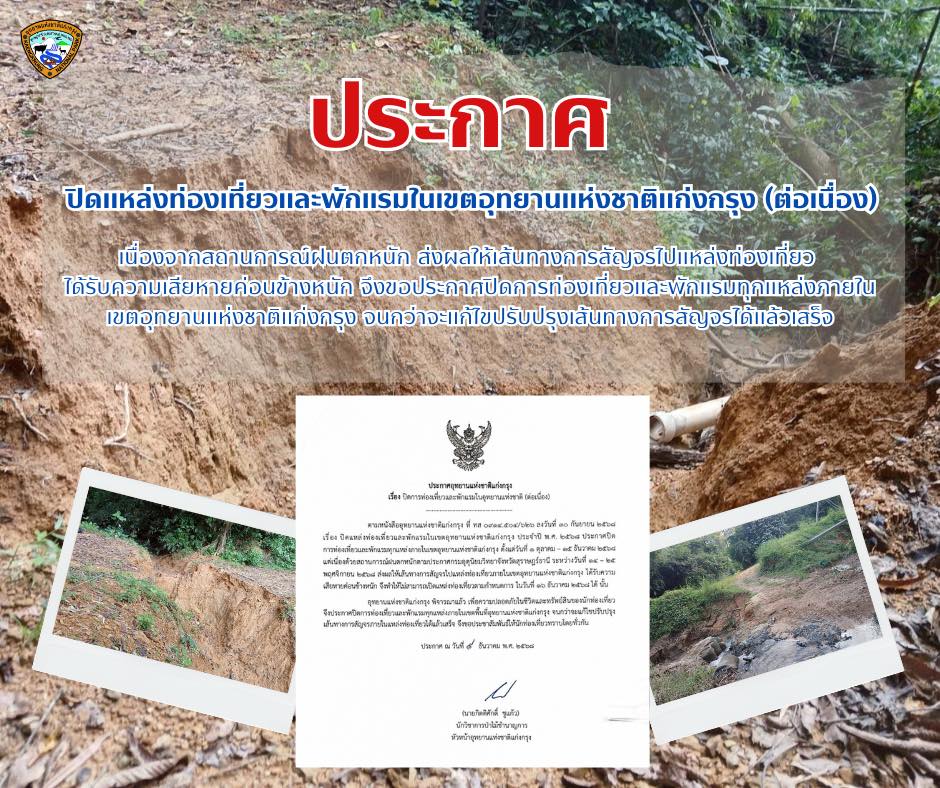 อุทยานแห่งชาติแก่งกรุง ประกาศปิดแหล่งท่องเที่ยวและพักแรมในเขตอุทยานแห่งชาติแก่งกรุง (ต่อเนื่อง) เนื่องจากสถานการณ์ฝนตกหนัก ส่งผลให้เส้นทางการสัญจรไปแหล่งท่องเที่ยว ได้รับความเสียหายค่อนข้างหนัก ทําให้ไม่สามารถเปิดแหล่งท่องเที่ยวตามกําหนดการ ในวันที่ 16 ธันวาคม 2568จึงขอประกาศปิดการท่องเที่ยวและพักแรมทุกแหล่งภายในเขตอุทยานแห่งชาติแก่งกรุง จนกว่าจะแก้ไขปรับปรุงเส้นทางการสัญจรได้แล้วเสร็จ