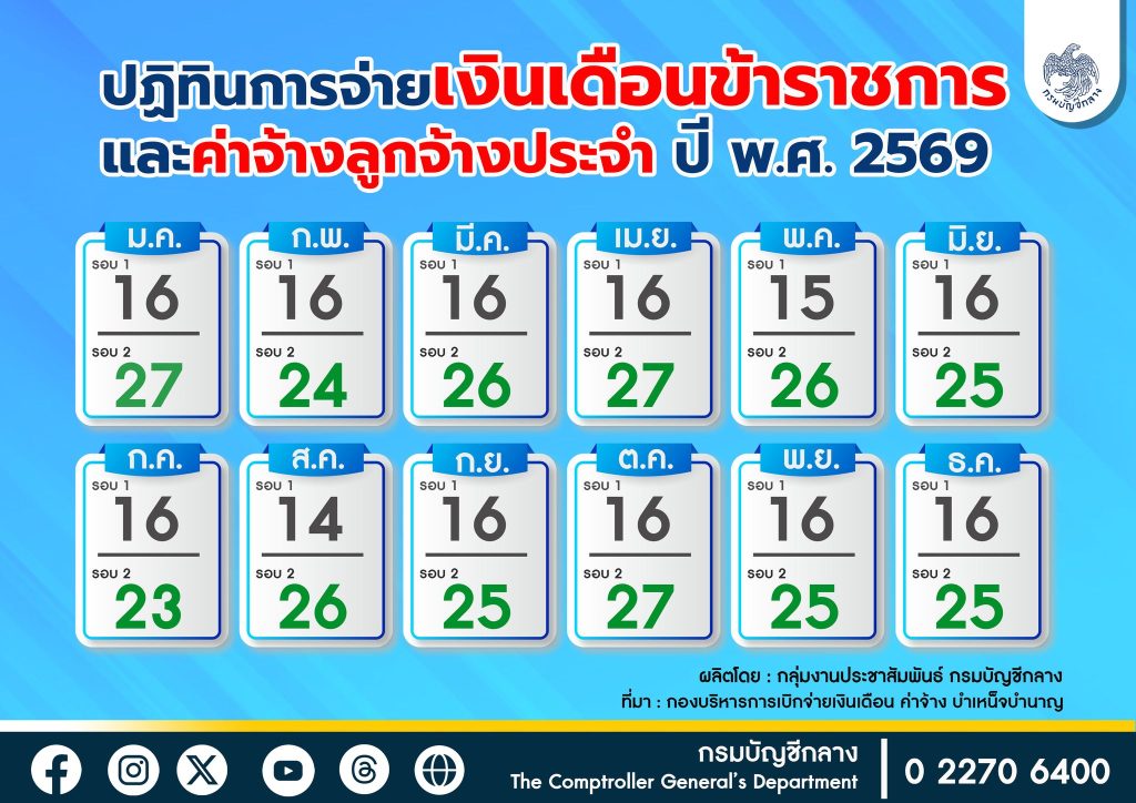 กรมบัญชีกลาง ประกาศปฏิทินการจ่ายเงินเดือนข้าราชการและค่าจ้างลูกจ้างประจำ ปี พ.ศ. 2569