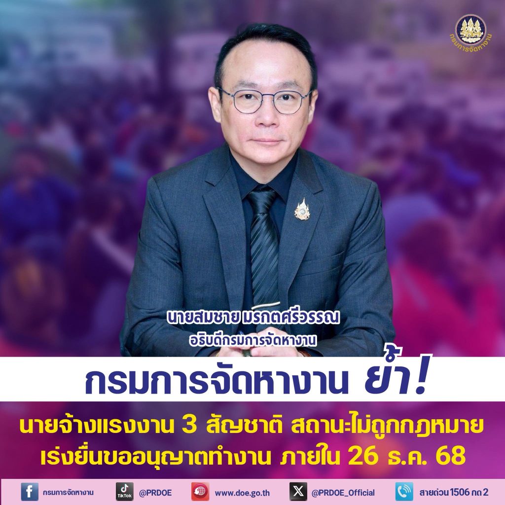 กรมการจัดหางาน ย้ำนายจ้างแรงงาน 3 สัญชาติ สถานะไม่ถูกต้อง เร่งยื่นขออนุญาตทำงาน ภายใน 26 ธ.ค. 68