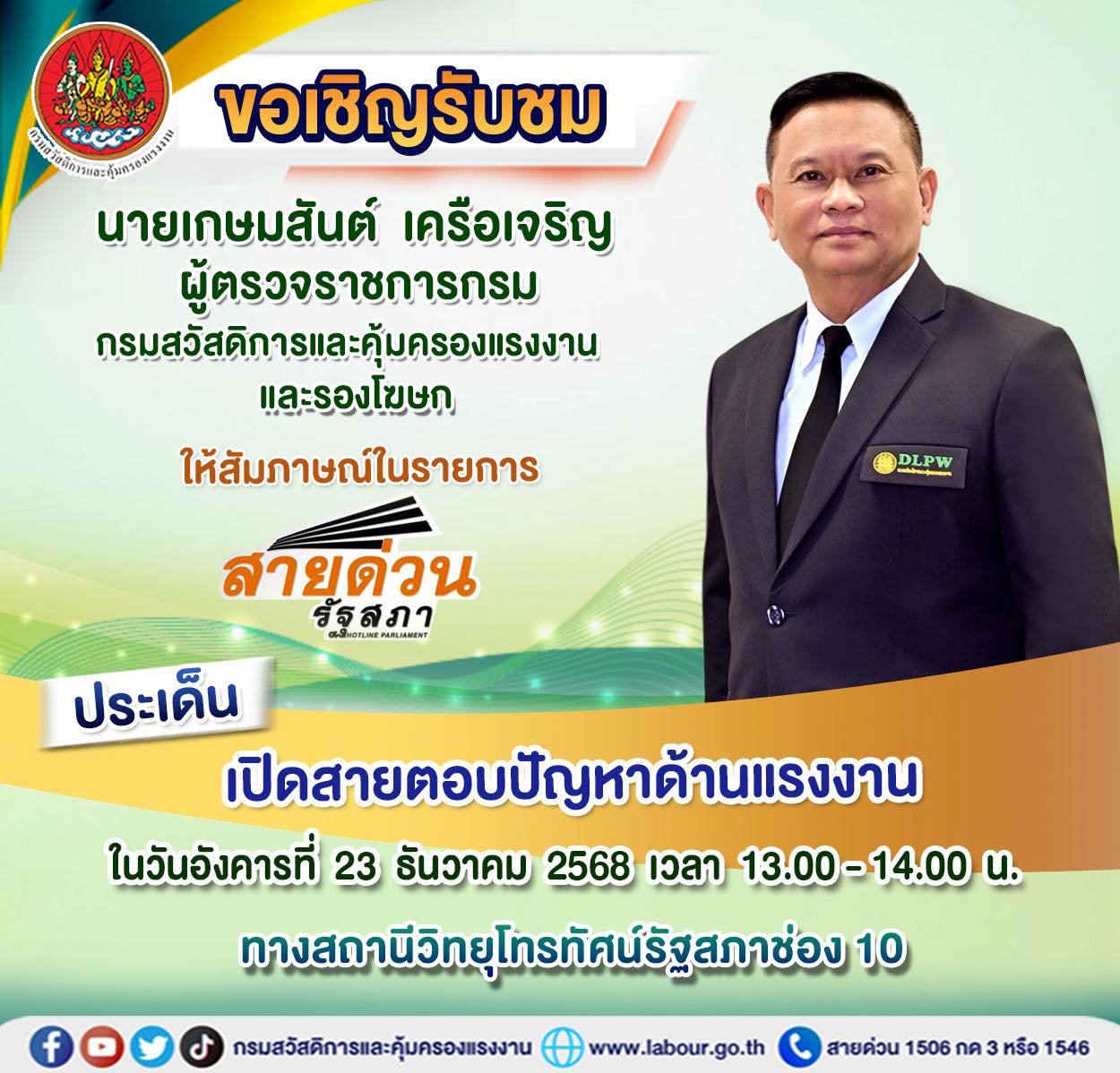 กรมสวัสดิการและคุ้มครองแรงงาน จัดการสัมภาษณ์สดในรายการ สายด่วนรัฐสภา วันที่ 23 ธันวาคม 2568 เวลา 13.00 -14.00 น. ณ สถานีวิทยุโทรทัศน์รัฐสภา ช่อง 10