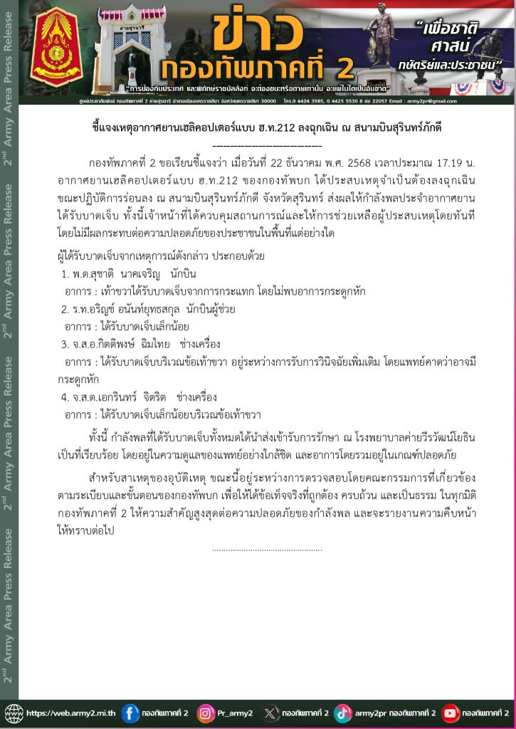 กองทัพภาคที่ 2 ขอเรียนชี้แจงว่า เมื่อวันที่ 22 ธันวาคม พ.ศ. 2568 เวลาประมาณ 17.19 น. อากาศยานเฮลิคอปเตอร์แบบ ฮ.ท.212 ของกองทัพบก ได้ประสบเหตุจำเป็นต้องลงฉุกเฉิน ขณะปฏิบัติการร่อนลง ณ สนามบินสุรินทร์ภักดี จังหวัดสุรินทร์ ส่งผลให้กำลังพลประจำอากาศยาน ได้รับบาดเจ็บ ทั้งนี้เจ้าหน้าที่ได้ควบคุมสถานการณ์และให้การช่วยเหลือผู้ประสบเหตุโดยทันที โดยไม่มีผลกระทบต่อความปลอดภัยของประชาชนในพื้นที่แต่อย่างใด