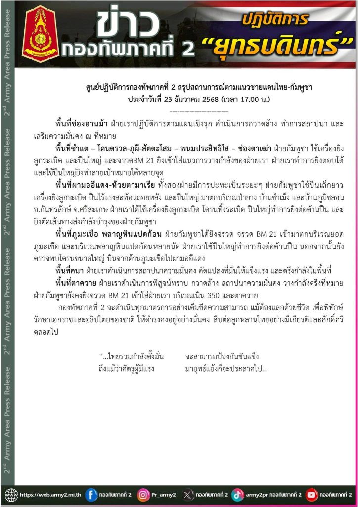 กองทัพภาคที่ 2 สรุปสถานการณ์ตามแนวชายแดนไทย – กัมพูชา ประจำวันที่ 23 ธันวาคม 2568 (เวลา 17.00 น.)