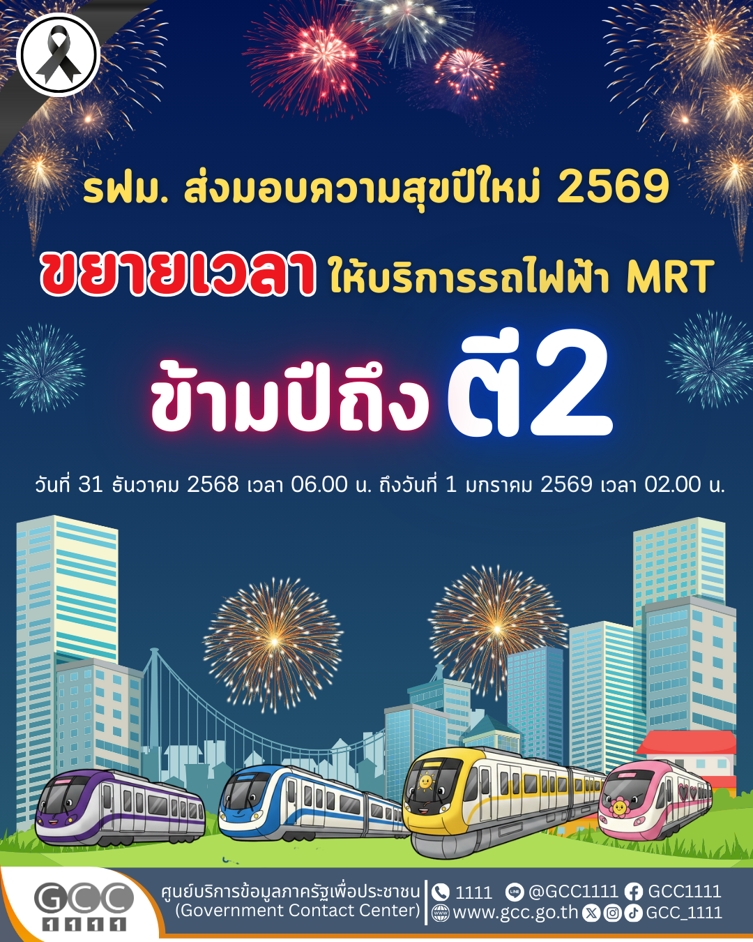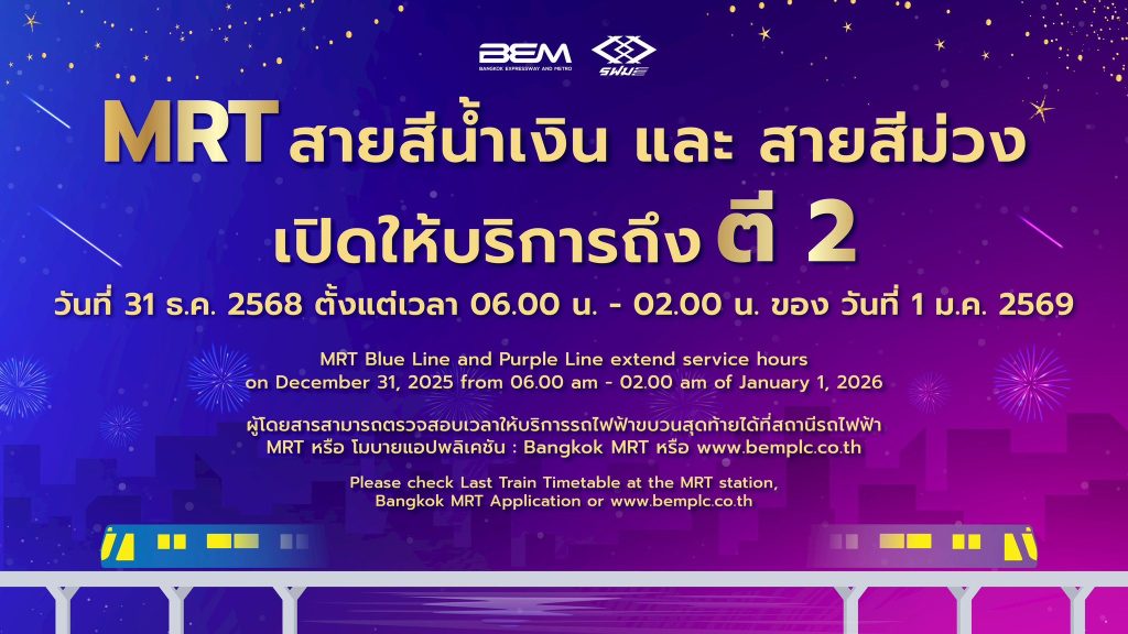 กระทรวงคมนาคม และ รฟม. ส่งความสุขในคืนส่งท้ายปีเก่าต้อนรับปีใหม่ 2569 ขยายเวลาให้บริการรถไฟฟ้า MRT 4 สาย ถึงตี 2 และขยายเวลาเปิดให้บริการอาคารและลานจอดรถ เพื่ออำนวยความสะดวกให้ประชาชน