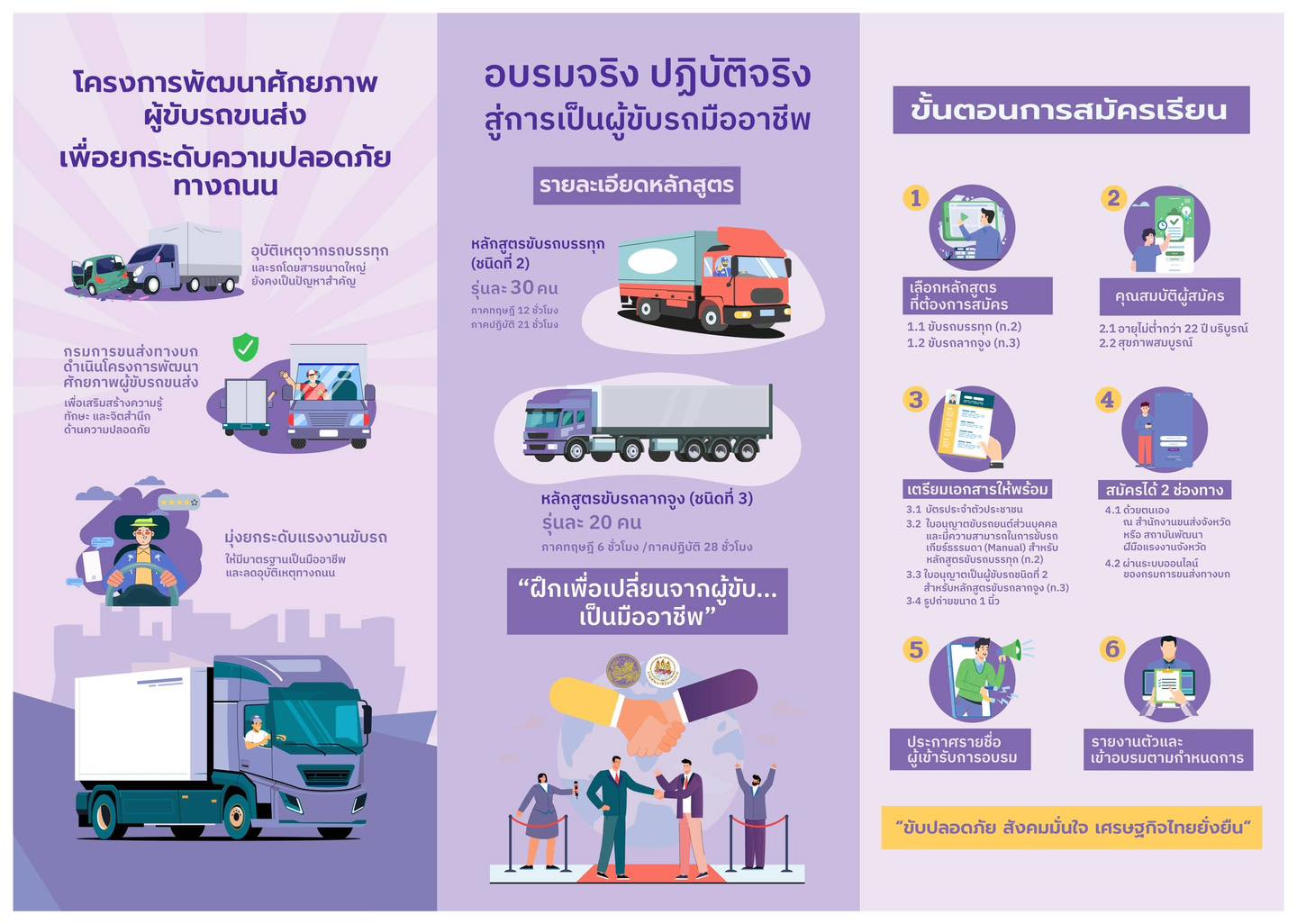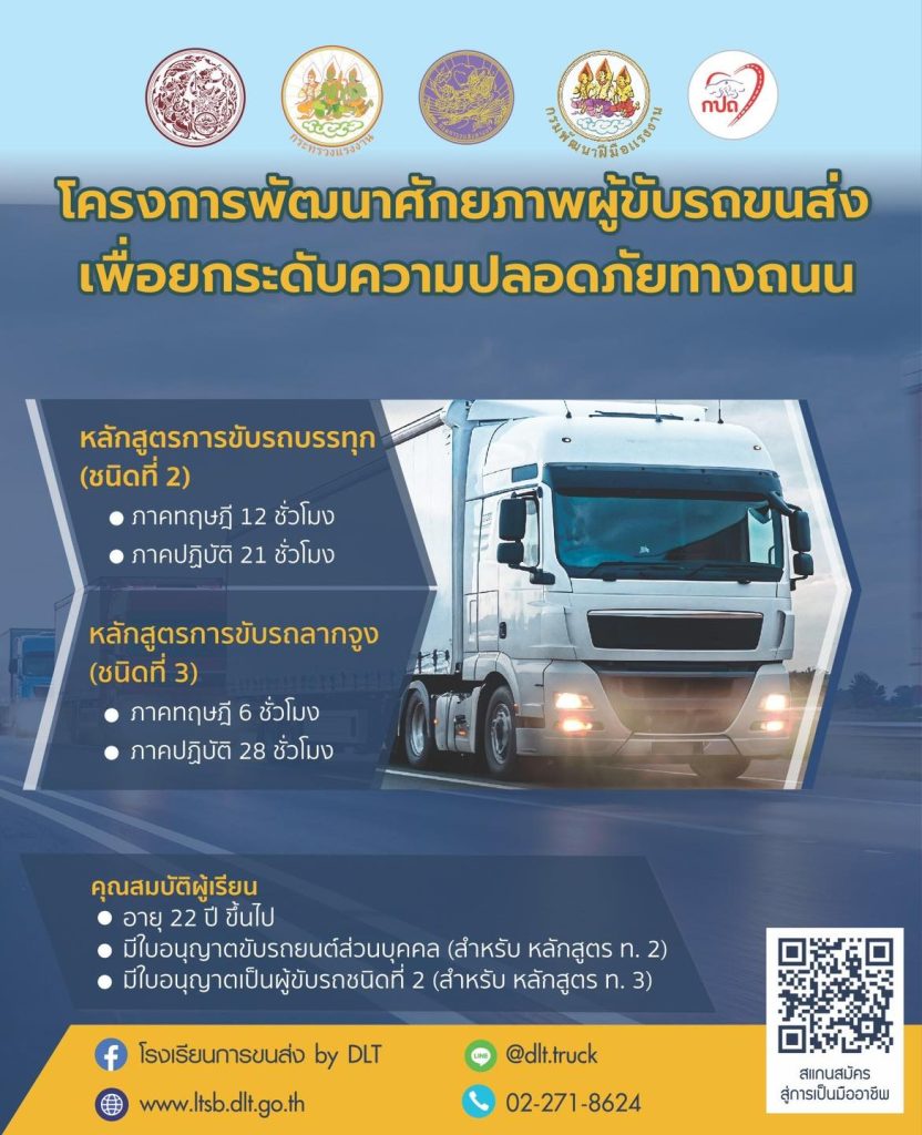 กรมการขนส่งทางบก ร่วมกับ กรมพัฒนาฝีมือแรงงาน เชิญร่วมโครงการพัฒนาศักยภาพผู้ขับรถขนส่งเพื่อยกระดับความปลอดภัยทางถนน เพื่อพัฒนาศักยภาพผู้ขับรถทั้งรถโดยสารและรถบรรทุก ให้มีทักษะ ความรู้ความสามารถ พฤติกรรมขับขี่ปลอดภัย และลดความสูญเสียจากอุบัติเหตุ ผลิตพนักงานขับรถที่มีคุณภาพ ลดปัญหาการขาดแคลนพนักงานขับรถในภาคการขนส่ง สร้างนักขับรถมืออาชีพ พร้อมเข้าสู่ตลาดแรงงานขนส่งทันทีที่จบหลักสูตร ไม่เสียค่าใช้จ่ายในการฝึกอบรม