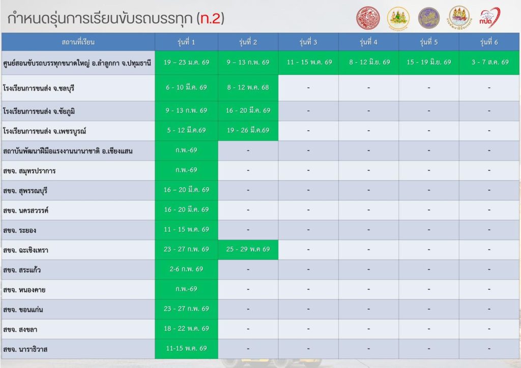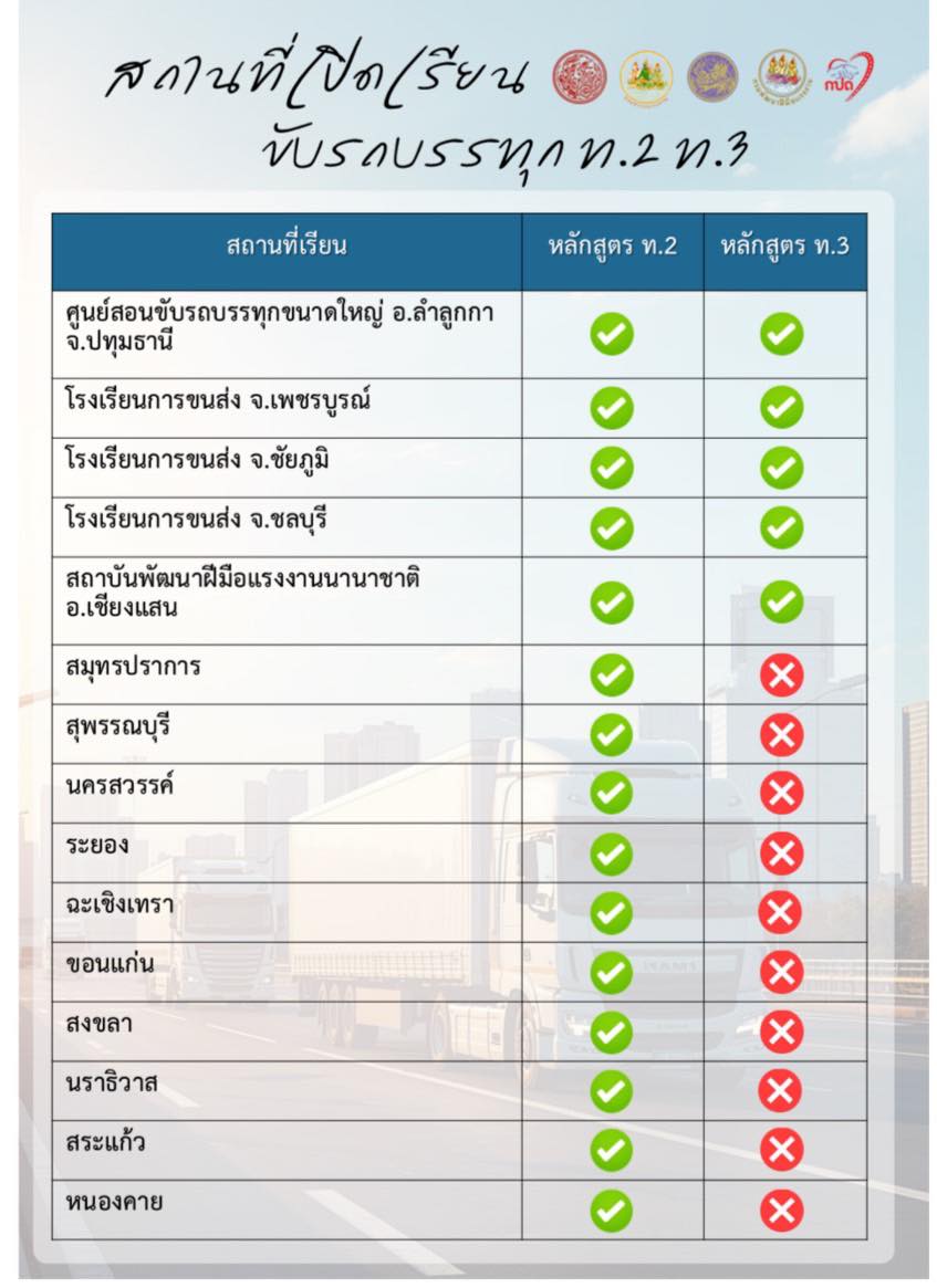 สำหรับหลักสูตร ท.2 (รถบรรทุก) เปิดอบรมใน 15 แห่งทั่วประเทศ ได้แก่ ภาคกลาง/ตะวันออก ได้แก่ ศูนย์สอนขับรถบรรทุกขนาดใหญ่ อ.ลำลูกกา จ.ปทุมธานี , ชลบุรี , สมุทรปราการ , สุพรรณบุรี , นครสวรรค์ , ระยอง , ฉะเชิงเทรา , และสระแก้ว ภาคเหนือ ได้แก่ เชียงราย และเพชรบูรณ์ ภาคอีสาน ได้แก่ ชัยภูมิ, หนองคาย และขอนแก่น ภาคใต้ ได้แก่ สงขลา และนราธิวาส เริ่มอบรมตั้งแต่ มกราคม – สิงหาคม 2569