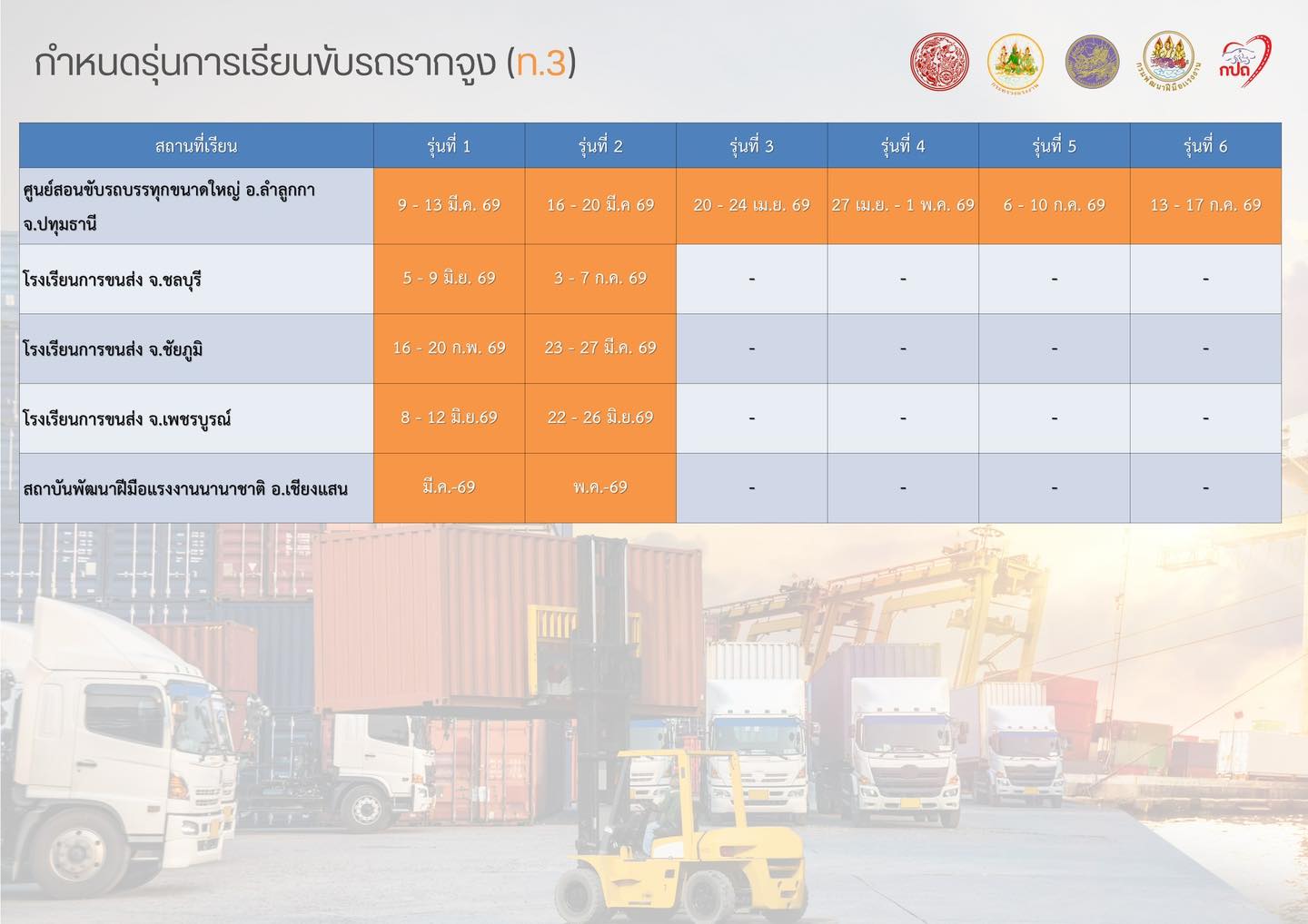 และหลักสูตร ท.3 (รถลากจูง) เปิดอบรม 5 แห่ง ได้แก่ ศูนย์สอนขับรถบรรทุกขนาดใหญ่ อ.ลำลูกกา จ.ปทุมธานี , ชลบุรี , ชัยภูมิ , เพชรบูรณ์ และเชียงราย เริ่มอบรมตั้งแต่เดือนกุมภาพันธ์ – กรกฎาคม 2569 สอบถามข้อมูลเพิ่มเติมได้ที่ Facebook : โรงเรียน การขนส่ง by DLT แอปพลิเคชัน Line : @dlt.truck และหมายเลขโทรศัพท์ 02-271-8624