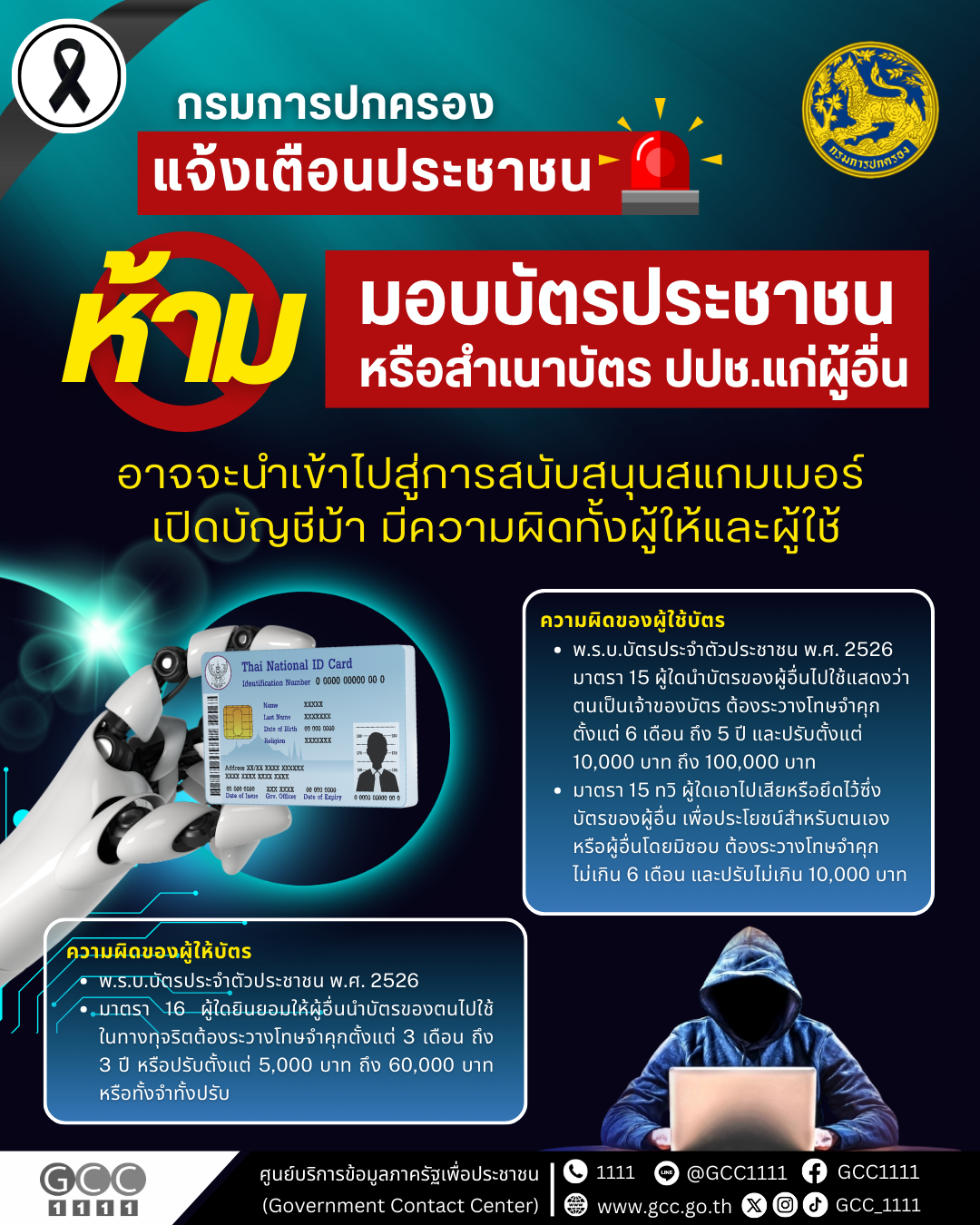 กรมการปกครอง แจ้งเตือนประชาชนไม่มอบบัตรหรือสำเนาบัตรประจำตัวประชาชนแก่ผู้อื่น มีความผิดตามกฎหมาย ห้ามไม่ให้มอบบัตรประชาชนหรือ สำเนาบัตรประจำตัวประชาชน อาจจะนำเข้าไปสู่การสนับสนุนสแกมเมอร์ เปิดบัญชีม้า มีความผิดทั้งผู้ให้และผู้ใช้