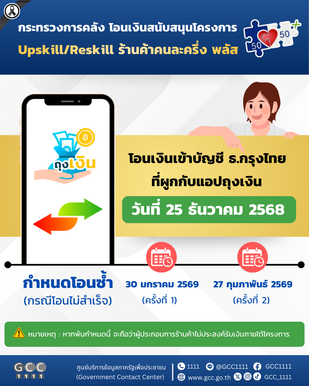กระทรวงการคลัง เปิดเผยผลการดำเนินโครงการพัฒนาความรู้และทักษะ (Upskill/Reskill) สำหรับร้านค้าที่เข้าร่วมโครงการคนละครึ่ง พลัส ระหว่างวันที่ 19 พฤศจิกายน – 19 ธันวาคม 2568 พร้อมโอนเงินสนับสนุนผ่านบัญชีธนาคารกรุงไทย ที่ผูกกับแอปพลิเคชัน “ถุงเงิน” ในวันที่ 25 ธันวาคม 2568
