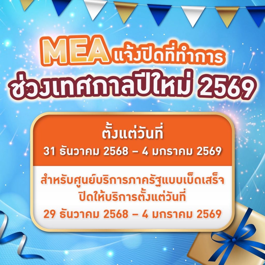 MEA หรือการไฟฟ้านครหลวง แจ้งปิดที่ทำการในช่วงเทศกาลปีใหม่ 2569 โดย ศูนย์บริการภาครัฐแบบเบ็ดเสร็จ (Government Center) ทุกสาขา จะปิดให้บริการตั้งแต่วันที่ 29 ธันวาคม 2568 – 4 มกราคม 2569 ในส่วนที่ทำการของการไฟฟ้านครหลวง จะปิดให้บริการตั้งแต่วันที่ 31 ธันวาคม 2568 – 4 มกราคม 2569 และจะเปิดให้บริการตามปกติในวันจันทร์ที่ 5 มกราคม 2569
