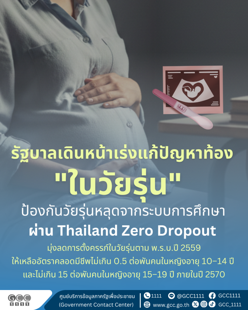รัฐบาล เดินหน้าป้องกันและแก้ไขปัญหาการตั้งครรภ์ในวัยรุ่น ผ่านโครงการ Thailand Zero Dropout ในการดูแลช่วยเหลือวัยรุ่นตั้งครรภ์ให้กลับเข้าสู่ระบบการศึก โดยตั้งเป้าหมายลดปัญหาการตั้งครรภ์ในวัยรุ่น ตาม พ.ร.บ.การป้องกันและแก้ไขปัญหาการตั้งครรภ์ในวัยรุ่น พ.ศ. 2559 ลดอัตราคลอดมีชีพในวัยรุ่นลงให้เหลือไม่เกิน 0.5 ต่อพันคน ในหญิงอายุ 10 – 14 ปี และไม่เกิน 15 ต่อพันคน ในหญิงอายุ 15 – 19 ปี ภายในปี 2570 เพื่อปกป้องวัยรุ่นไทยให้ได้รับสิทธิพื้นฐาน และการช่วยเหลือด้านสุขภาพอย่างครอบคลุมเป็นธรรมและทั่วถึง พร้อมทั้งเติบโตอย่างเต็มศักยภาพสมบูรณ์แข็งแรงต่อไป