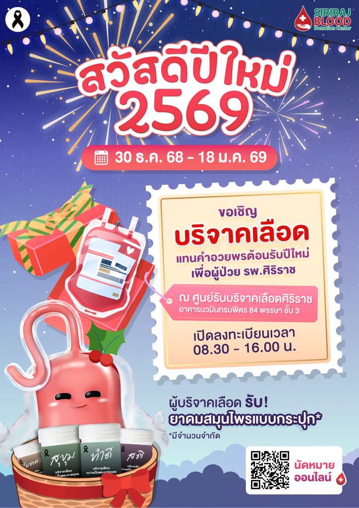 ศูนย์รับบริจาคเลือดศิริราช ขอเชิญบริจาคเลือด แทนคำอวยพรต้อนรับปีใหม่ 2569 เพื่อผู้ป่วย รพ.ศิริราช ข่าวสารกิจกรรม, ปีใหม่, เทศกาล ศูนย์รับบริจาคเลือดศิริราช ขอเชิญบริจาคเลือด แทนคำอวยพรต้อนรับปีใหม่ 2569 เพื่อผู้ป่วย รพ.ศิริราช ศูนย์รับบริจาคเลือดศิริราช ขอเชิญบริจาคเลือด แทนคำอวยพรต้อนรับปีใหม่ 2569 เพื่อผู้ป่วยโรงพยาบาลศิริราช วันที่ 30 ธันวาคม 2568 – 18 มกราคม 2569 ณ ศูนย์รับบริจาคเลือดศิริราช เปิดลงทะเบียนเวลา 08.30 – 16.00 น. ผู้บริจาคเลือดรับยาดมสมุนไพรแบบกระปุก (มีจำนวนจำกัด) การเตรียมตัวก่อนบริจาคเลือด : https://shorturl.at/Ezpzy หมายเหตุ : อย่าลืมพกบัตรประชาชนมาด้วย ที่มา : Facebook ศูนย์รับบริจาคเลือดศิริราช อาคารนวมินทรบพิตร ๘๔ พรรษา Post Views: 36 FacebookFacebookXTwitterLINELine