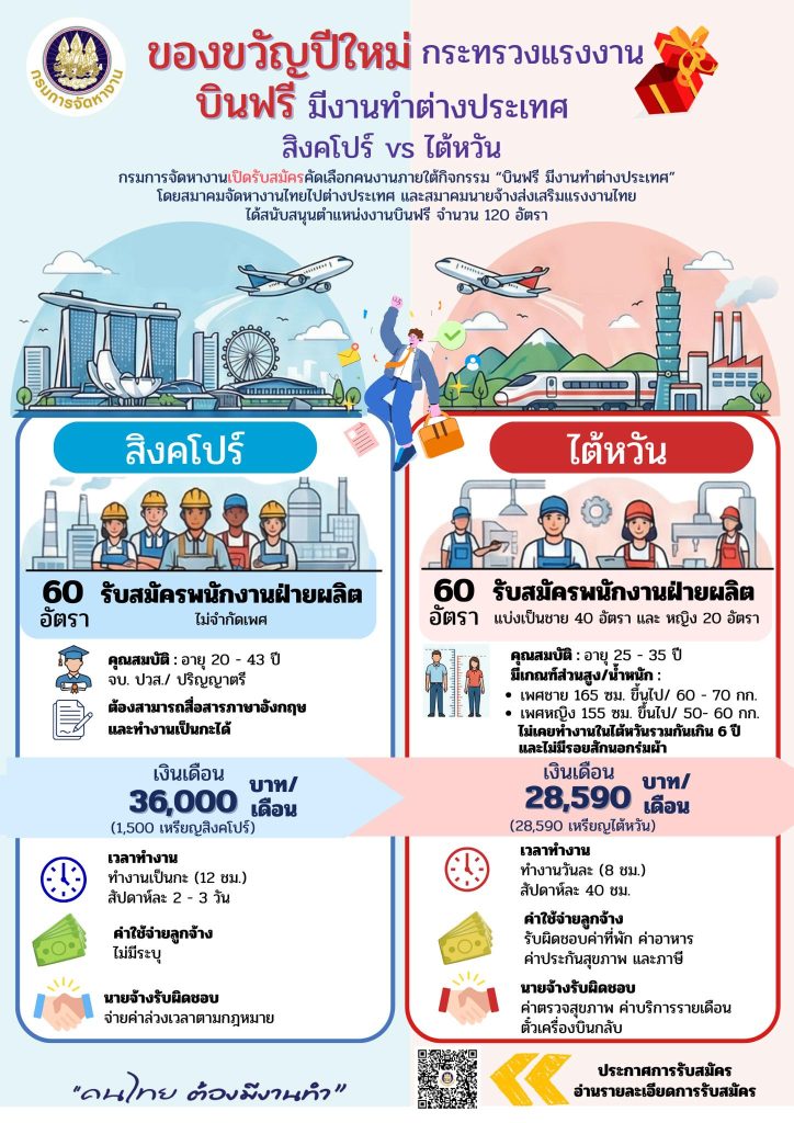 กรมการจัดหางาน เปิดรับสมัครคัดเลือกคนงานภายใต้กิจกรรม “บินฟรี มีงานทำต่างประเทศ” จำนวน 120 อัตรา