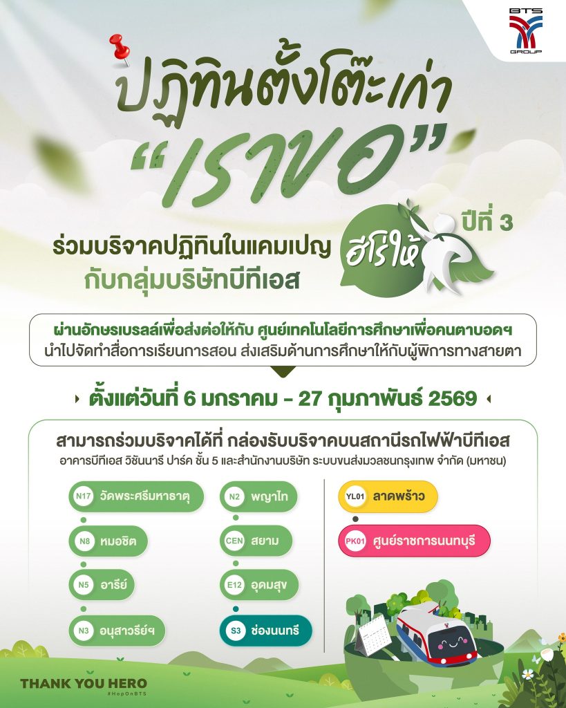 บริษัทบีทีเอส เชิญร่วมบริจาคปฏิทินตั้งโต๊ะเก่าในแคมเปญ “ฮีโร่ให้” เป็นผู้ให้อักษรเบรลล์ ปีที่ 3
