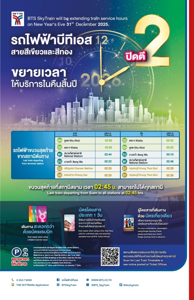 คุณสุรพงษ์ เลาหะอัญญา กรรมการผู้อำนวยการใหญ่ บริษัท ระบบขนส่งมวลชนกรุงเทพ จำกัด (มหาชน) ผู้ให้บริการรถไฟฟ้าบีทีเอส กล่าวว่า เนื่องในโอกาสเทศกาลส่งท้ายปีเก่าต้อนรับปีใหม่ 2569 บริษัทฯ ร่วมกับกรุงเทพมหานคร และบริษัท กรุงเทพธนาคม จำกัด ขยายเวลาให้บริการเดินรถไฟฟ้าบีทีเอสทุกสถานี ทั้งสายสุขุมวิท และสายสีลม รวมถึงรถไฟฟ้าสายสีทอง ในคืนวันพุธ ที่ 31 ธันวาคม 2568 ถึงเวลา 02.00 น. ของวันพฤหัสบดี ที่ 1 มกราคม 2569