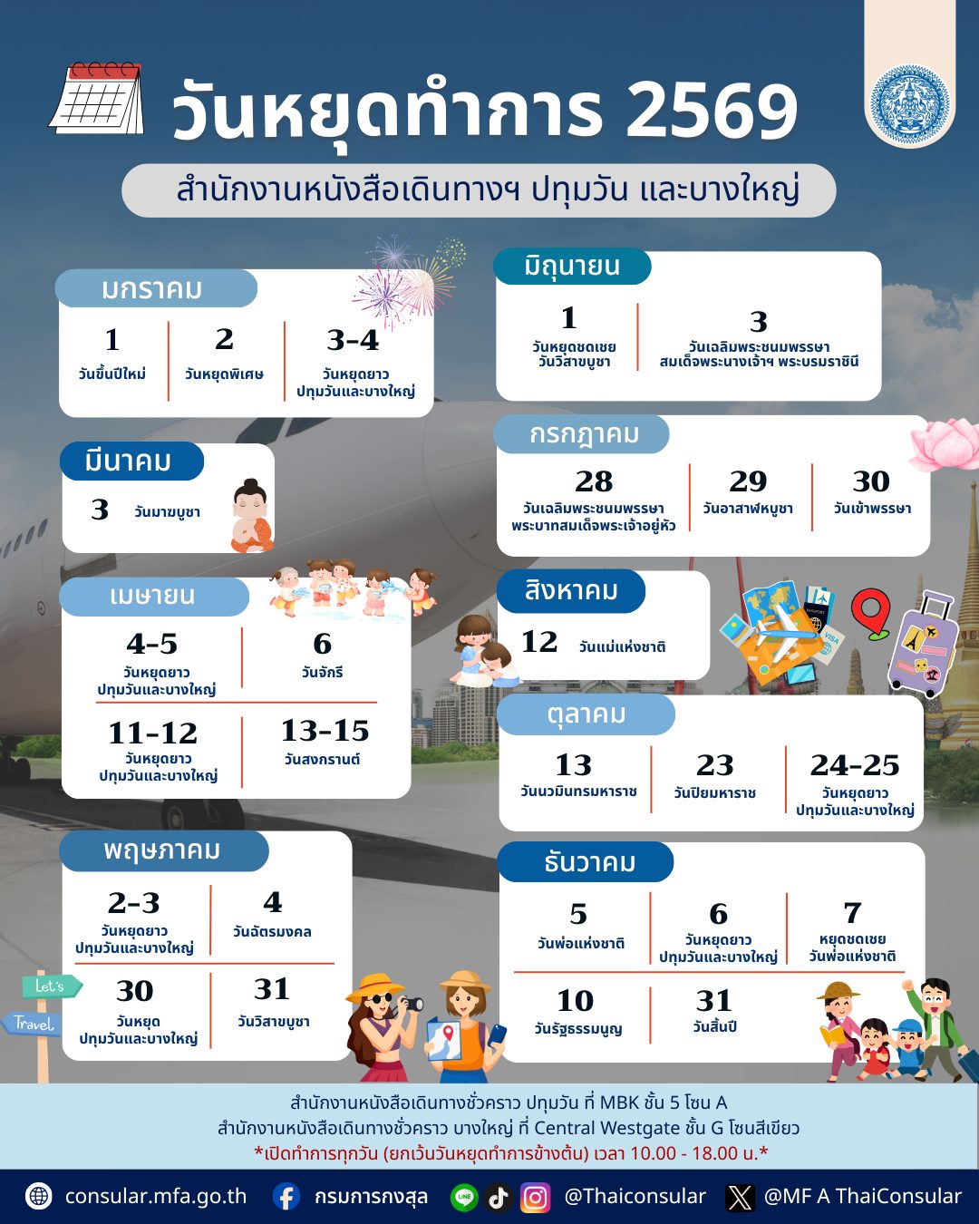 ประกาศกรมการกงสุล : วันหยุดทำการ ปี 2569 ของสำนักงานหนังสือเดินทางฯ ปทุมวัน และ บางใหญ่