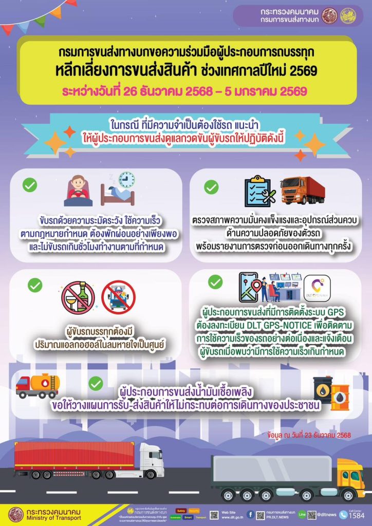 กรมการขนส่งทางบก ขอความร่วมมือผู้ประกอบการขนส่งสินค้า หลีกเลี่ยงการใช้รถบรรทุกและรถเปล่า รวมถึงงดจอดรถบนไหล่ทาง ระหว่างวันที่ 26 ธันวาคม 2568 – 5 มกราคม 2569 เพื่อป้องกันและลดอุบัติเหตุทางถนนในช่วงเทศกาลปีใหม่