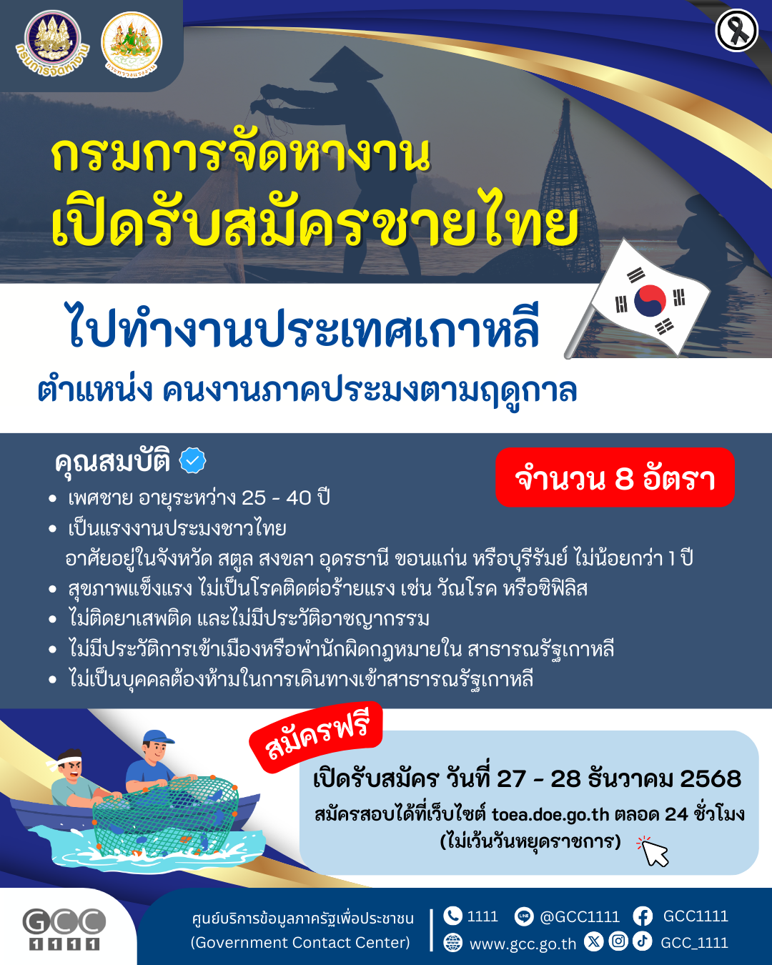 กรมการจัดหางาน เปิดรับสมัครคนหางานเพื่อไปทำงานภาคเกษตรและประมงตามฤดูกาล ณ อำเภอวันโด จังหวัดชอลลานัม สาธารณรัฐเกาหลี ตำแหน่ง คนงานภาคประมงตามฤดูกาล จำนวน 8 อัตรา เงินเดือน 2,146,560 – 2,278,660 วอน หรือประมาณ 46,580 – 49,446 บาท (ขึ้นอยู่กับอัตราแลกเปลี่ยน)  มีระยะเวลาการจ้างงาน 5 เดือน และสามารถขยายระยะเวลาเพิ่มได้อีก 3 เดือน ทำงานไม่เกิน 208 ชั่วโมงต่อเดือน ผู้สนใจสามารถสมัครได้ทางเว็บไซต์ toea.doe.go.th ตั้งแต่วันที่ 27 – 28 ธันวาคม 2568 ตลอด 24 ชั่วโมง