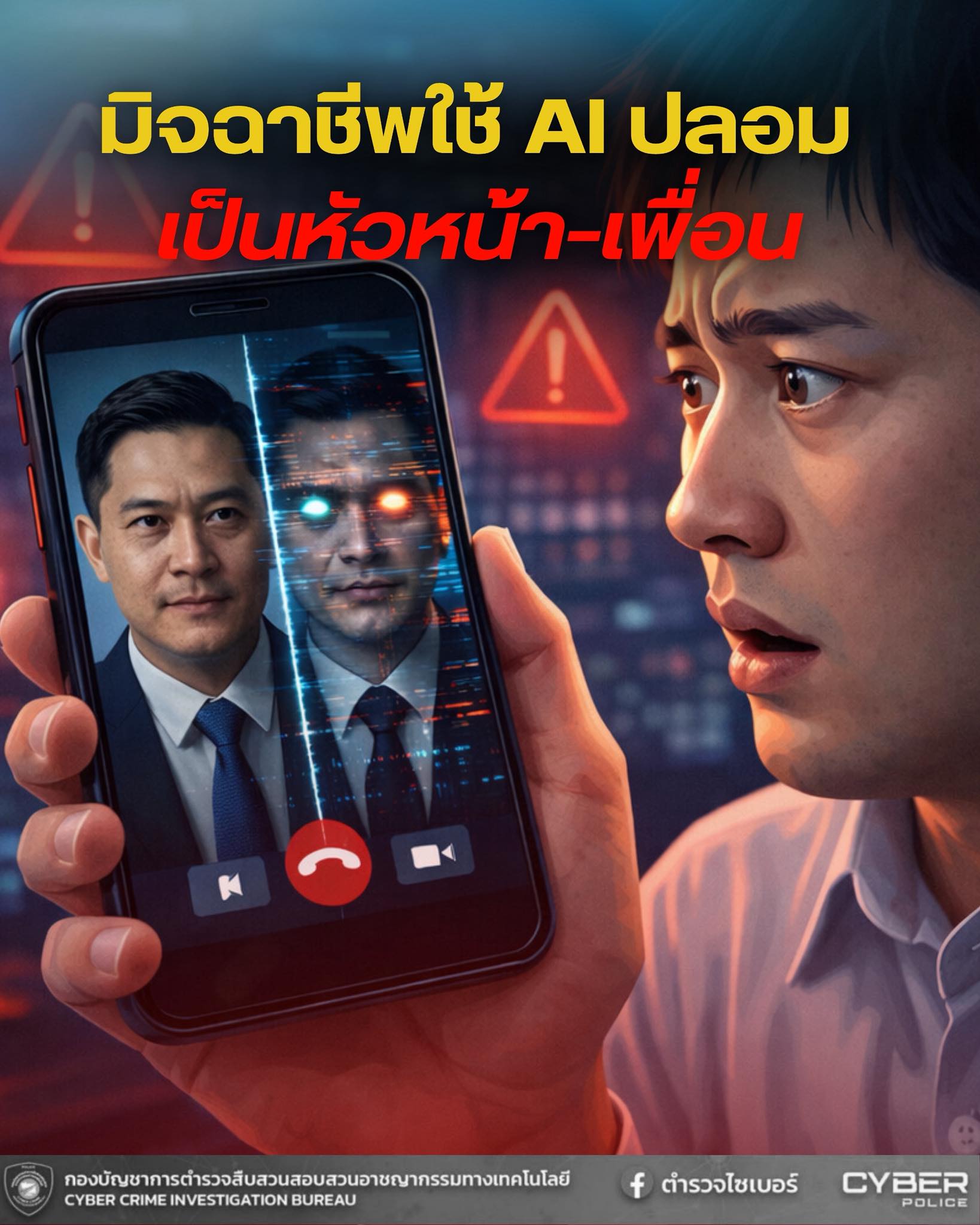 • ตำรวจไซเบอร์ แจ้งเตือนระวัง มิจฉาชีพปลอมเป็น “เพื่อน/หัวหน้า/ผู้บังคับบัญชา” ด้วย AI เสียง–ภาพ