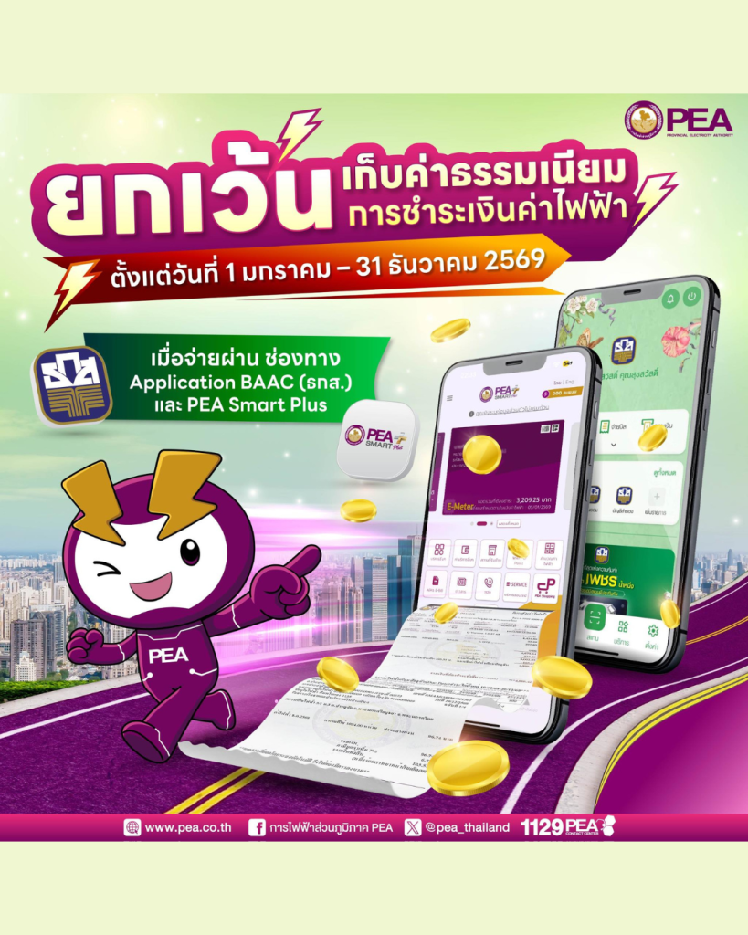 การไฟฟ้าส่วนภูมิภาค แจ้ง จ่ายบิลค่าไฟไม่ต้องเสียค่าธรรมเนียมการชำระเงิน ตลอดปี 2569 เมื่อชำระผ่านช่องทาง Application ที่ร่วมรายการดังนี้ BAAC (ธ.ก.ส.) PEA Smart Plus ตั้งแต่วันที่ 1 มกราคม – 31 ธันวาคม 2569 สอบถามข้อมูลเพิ่มเติมได้ที่ โทร. 1129 PEA Contact Center