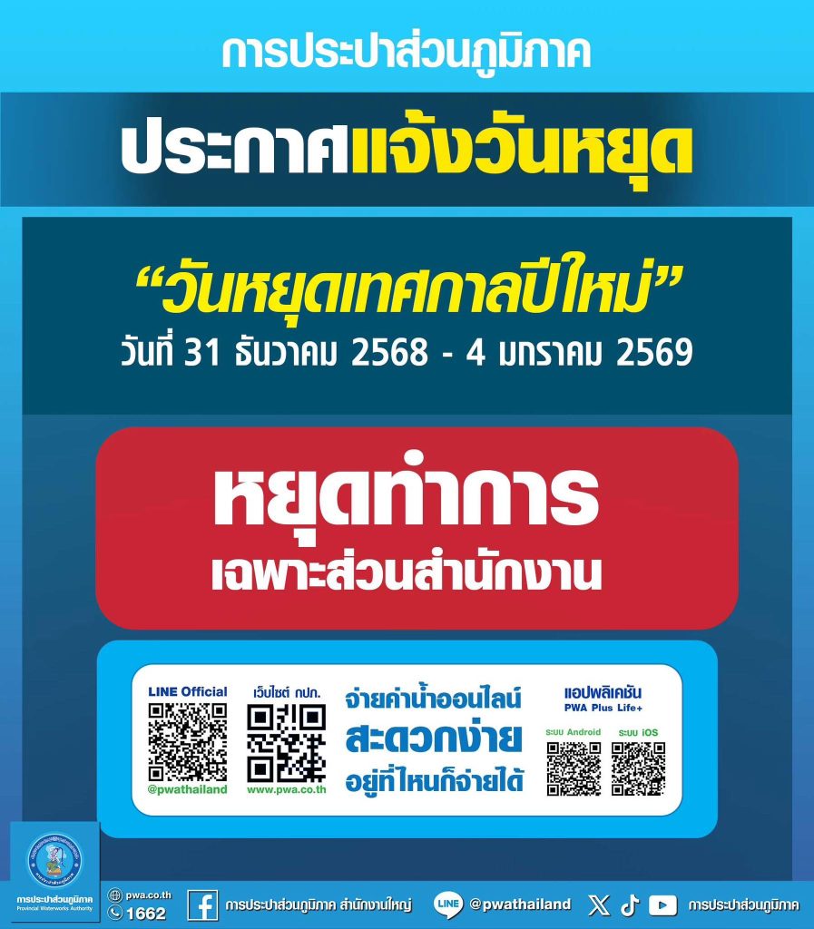 กปภ. แจ้งปิดทำการเฉพาะส่วนสำนักงาน วันที่ 31 ธ.ค. 68 – 4 ม.ค. 69 เนื่องในเทศกาลปีใหม่ ข่าวสารกิจกรรม, ปีใหม่, เทศกาล กปภ. แจ้งปิดทำการเฉพาะส่วนสำนักงาน วันที่ 31 ธ.ค. 68 – 4 ม.ค. 69 เนื่องในเทศกาลปีใหม่ การประปาส่วนภูมิภาค แจ้งปิดทำการเฉพาะส่วนสำนักงานวันที่ 31 ธันวาคม 2568 – 4 มกราคม 2569 วันหยุดเทศกาลปีใหม่ขอแนะนำช่องทางออนไลน์สำหรับชำระค่าน้ำและทำธุรกรรมต่าง ๆ ดังนี้PWA LINE OA : @pwathailand (https://line.me/ti/p/@pwathailand)Website : www.pwa.co.thPWA Plus Life บริการประปาครบ จบในแอปฯ เดียวหากลูกค้าประสบปัญหาการใช้บริการหรือต้องการสอบถามข้อมูลเพิ่มเติมสามารถติดต่อได้ที่ PWA Contact Center 1662 ตลอด 24 ชั่วโมง ที่มา : Facebook การประปาส่วนภูมิภาค สำนักงานใหญ่ Post Views: 27 FacebookFacebookXTwitterLINELine