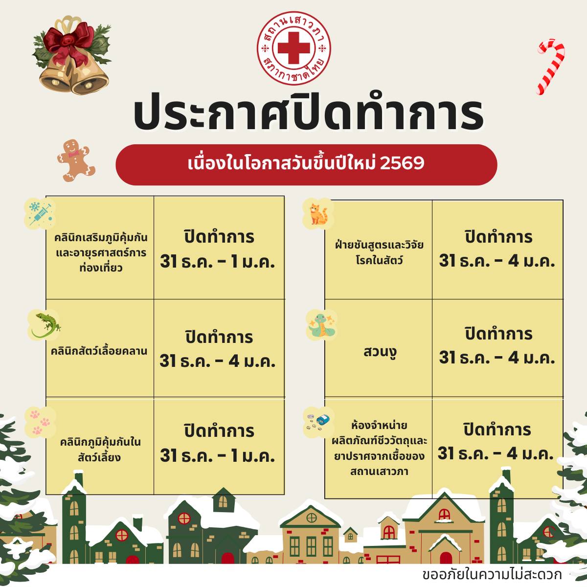 สถานเสาวภา สภากาชาดไทย แจ้งปิดทำการเนื่องในโอกาสวันขึ้นปีใหม่ 2569 ข่าวสารกิจกรรม, ปีใหม่, เทศกาล สถานเสาวภา สภากาชาดไทย แจ้งปิดทำการเนื่องในโอกาสวันขึ้นปีใหม่ 2569 สถานเสาวภา สภากาชาดไทย แจ้งปิดทำการเนื่องในโอกาสวันขึ้นปีใหม่ 2569ระหว่างวันที่ 31 ธันวาคม 2568 ถึง 1 มกราคม 2569 ดังนี้คลินิกเสริมภูมิคุ้มกันและอายุรศาสตร์การท่องเที่ยวคลินิกป้องกันโรคพิษสุนัขบ้าคลินิกพิษจากสัตว์และในระหว่างวันที่ 31 ธันวาคม 2568 ถึง 4 มกราคม 2569 ดังนี้สวนงูคลินิกสัตว์เลื้อยคลานคลินิกภูมิคุ้มกันในสัตว์เลี้ยงการจำหน่ายผลิตภัณฑ์ชีววัตถุและยาปราศจากเชื้อ ที่มา : Facebook สถานเสาวภา สภากาชาดไทย : Queen Saovabha Memorial Institute Post Views: 36 FacebookFacebookXTwitterLINELine
