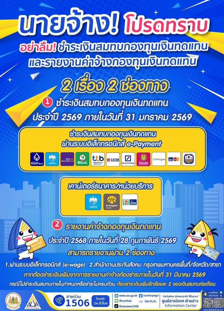 สำนักงานประกันสังคมแจ้งเตือนนายจ้างทุกแห่งให้ชำระเงินสมทบกองทุนเงินทดแทน ประจำปี 2569 ภายในวันที่ 31 มกราคม 2569 ผ่านระบบ e-Payment หรือเคาน์เตอร์ธนาคาร/หน่วยบริการที่กำหนด เพื่อให้ลูกจ้างได้รับสิทธิประโยชน์อย่างครบถ้วน พร้อมกันนี้ นายจ้างต้องรายงานค่าจ้างกองทุนเงินทดแทน ประจำปี 2568 ภายในวันที่ 28 กุมภาพันธ์ 2569 ผ่านระบบ e-Wage หรือสำนักงานประกันสังคม หากมีเงินสมทบเพิ่มเติมต้องชำระภายในวันที่ 31 มีนาคม 2569 มิฉะนั้นจะต้องชำระเงินเพิ่มตามกฎหมาย