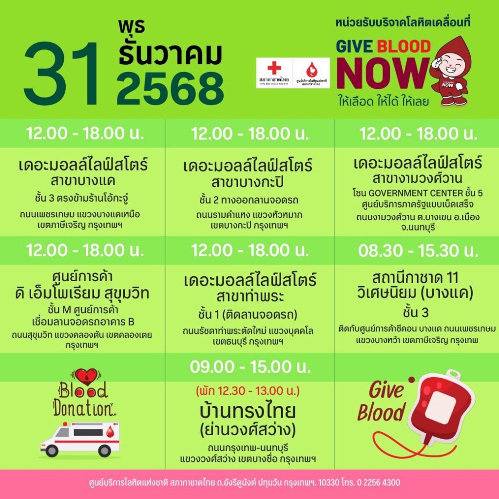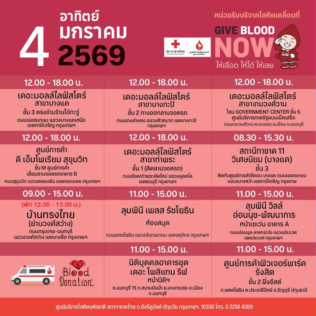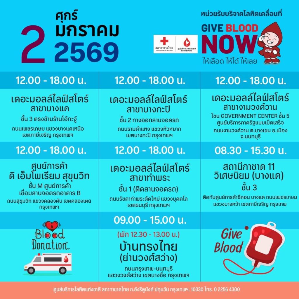สภากาชาดไทย ออกหน่วยรับบริจาคโลหิตเคลื่อนที่ ประจำวันที่ 29 ธันวาคม 2568 – 4 มกราคม 2569 ทั้งนี้ กรุณาแสดงบัตรประชาชนก่อนบริจาคโลหิตทุกครั้ง   สอบถามข้อมูลเพิ่มเติมได้ที่ ศูนย์บริการโลหิตแห่งชาติ สภากาชาดไทย โทร. 0 2256 4300 หมายเหตุ ปิดทำการ วันที่ 1 มกราคม