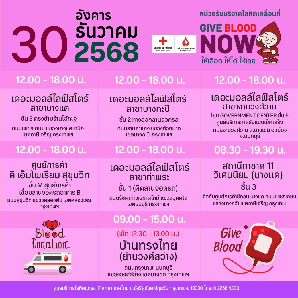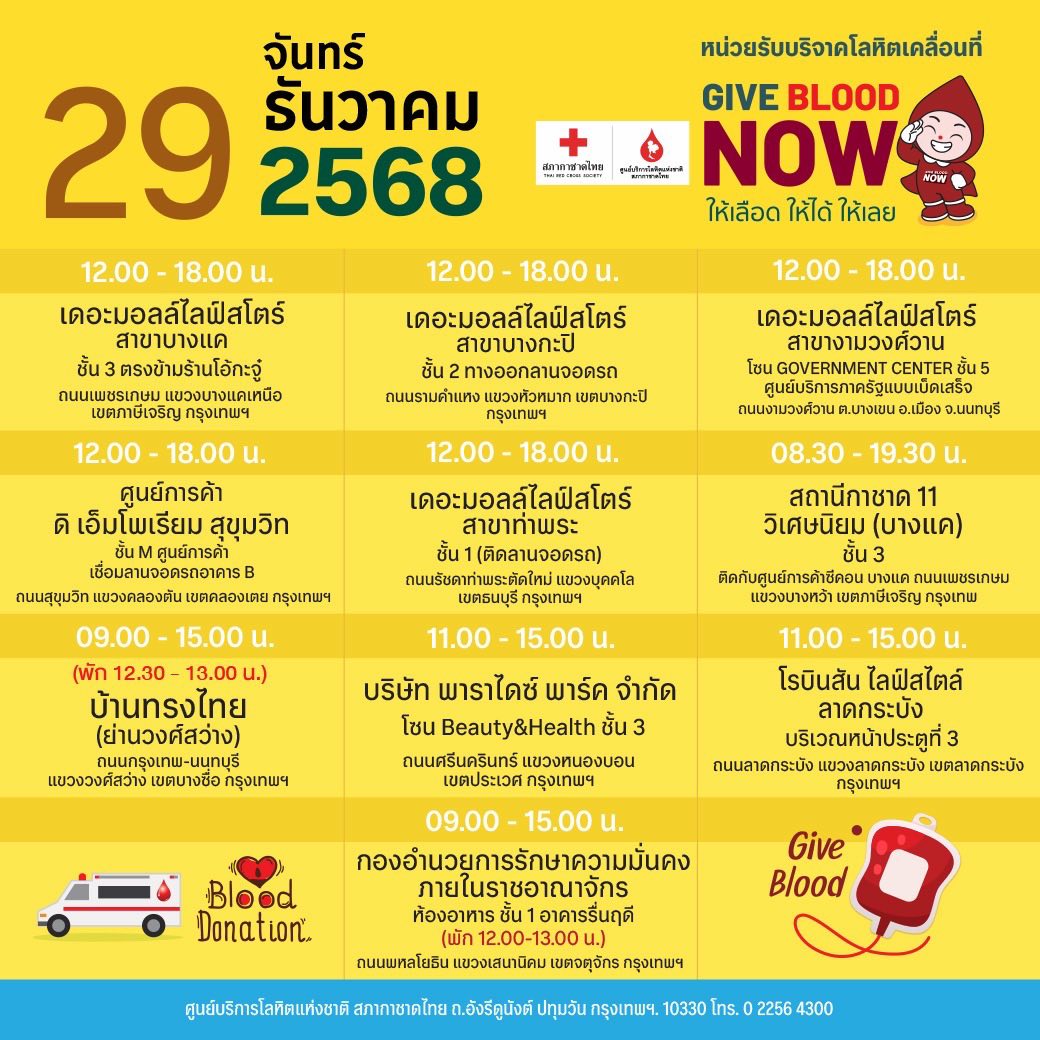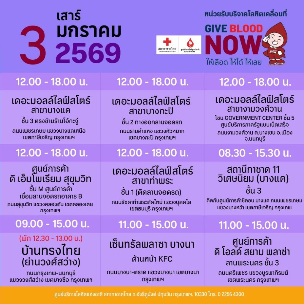สภากาชาดไทย ออกหน่วยรับบริจาคโลหิตเคลื่อนที่ ประจำวันที่ 29 ธันวาคม 2568 – 4 มกราคม 2569 ทั้งนี้ กรุณาแสดงบัตรประชาชนก่อนบริจาคโลหิตทุกครั้ง   สอบถามข้อมูลเพิ่มเติมได้ที่ ศูนย์บริการโลหิตแห่งชาติ สภากาชาดไทย โทร. 0 2256 4300 หมายเหตุ ปิดทำการ วันที่ 1 มกราคม
