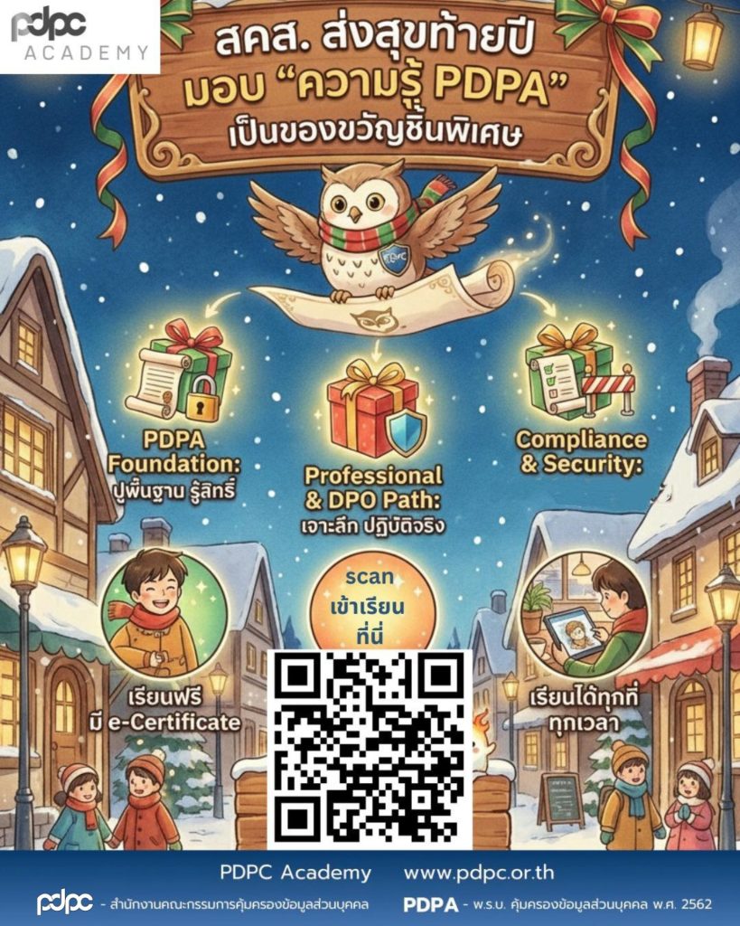 สำนักงานคณะกรรมการคุ้มครองข้อมูลส่วนบุคคล ส่งความสุขท้ายปี มอบ “ความรู้ PDPA” เป็นของขวัญ คอร์สเรียนออนไลน์ฟรี! เพื่อคนไทยก้าวสู่ปีใหม่ย่างปลอดภัยจากข้อมูลส่วนบุคคลรั่วไหล