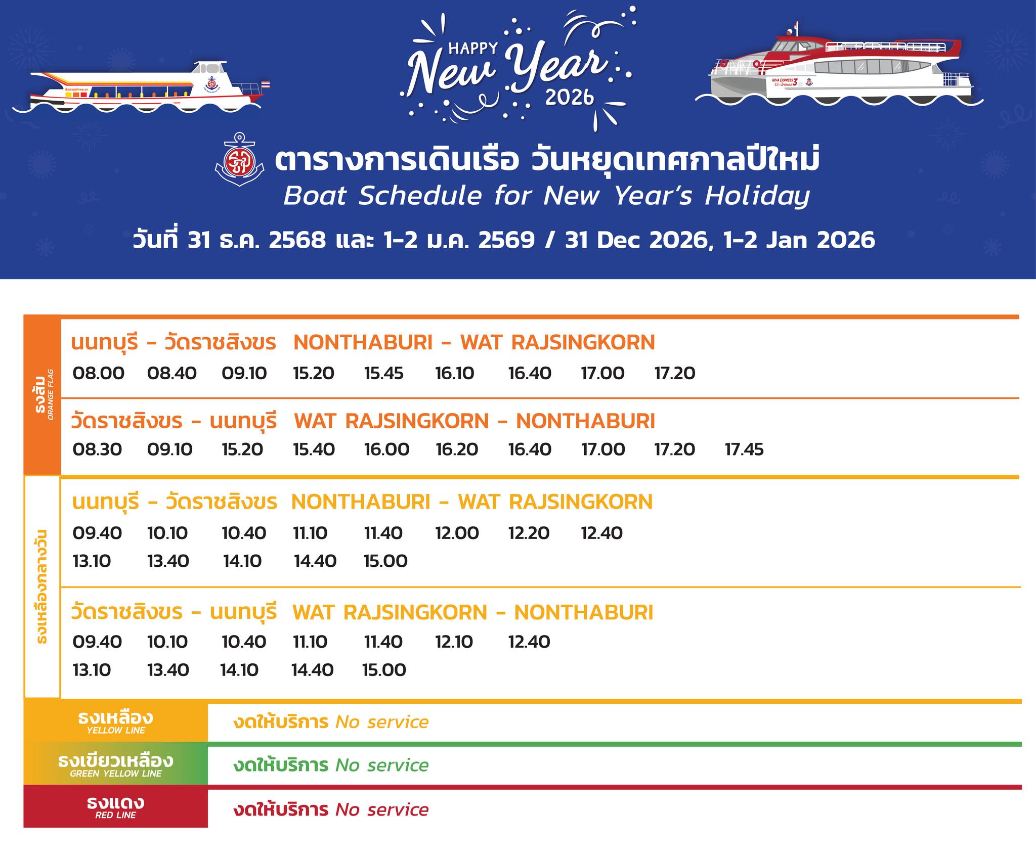 เรือด่วนเจ้าพระยา แจ้งตารางเวลาการให้บริการเรือโดยสาร เฉพาะวันที่ 31 ธันวาคม 2568 – 2 มกราคม 2569