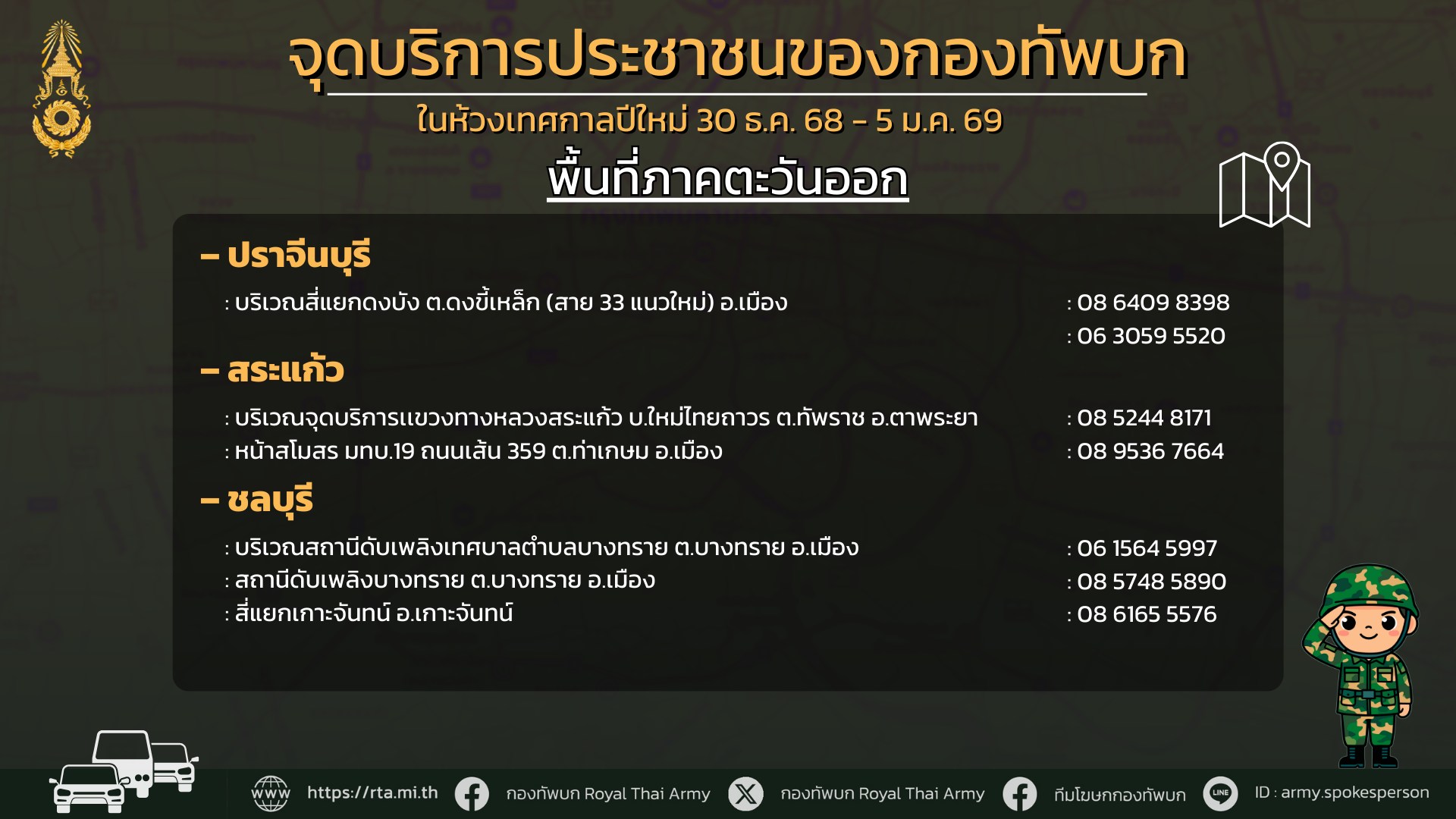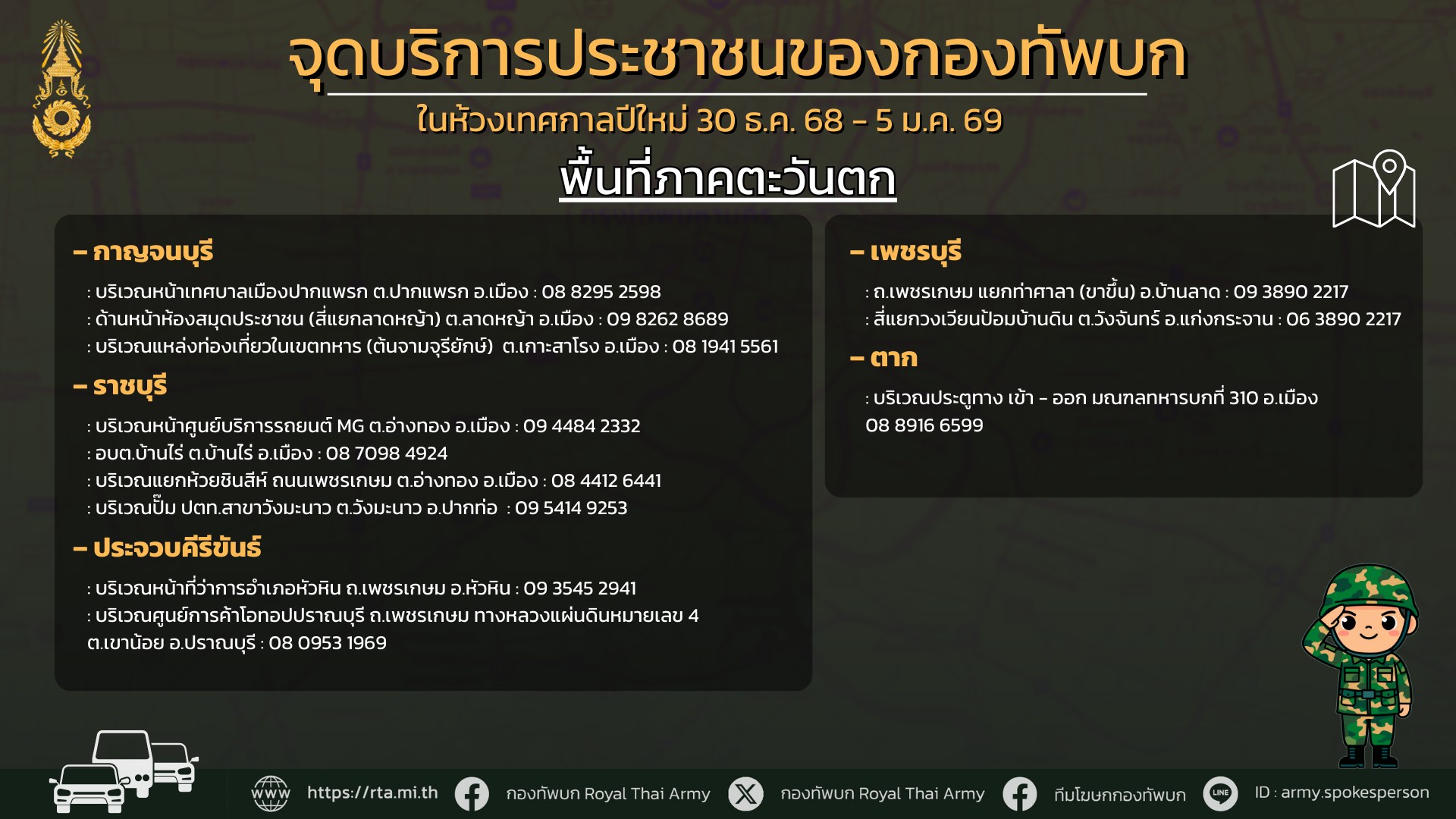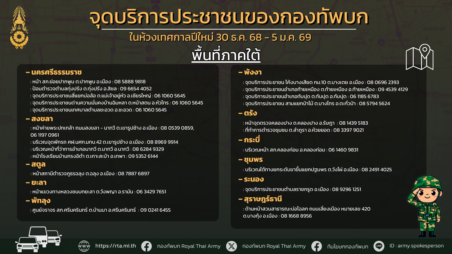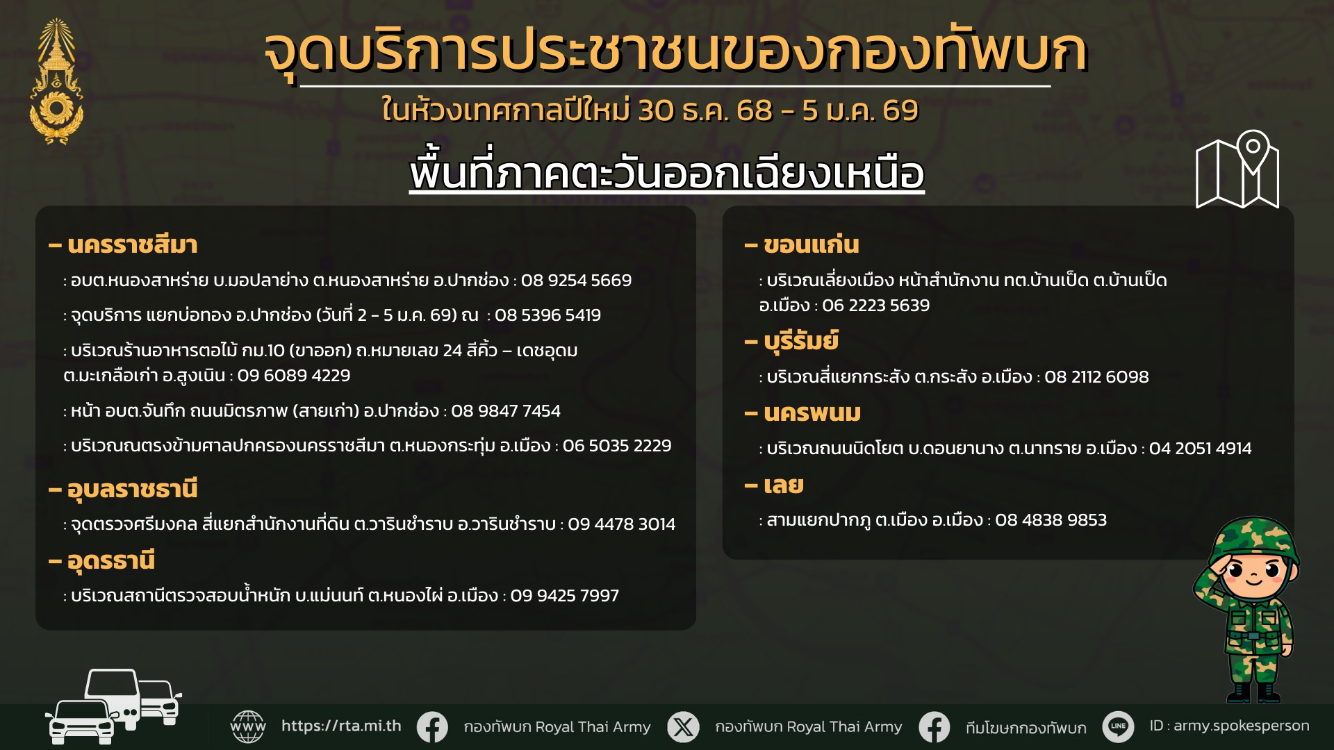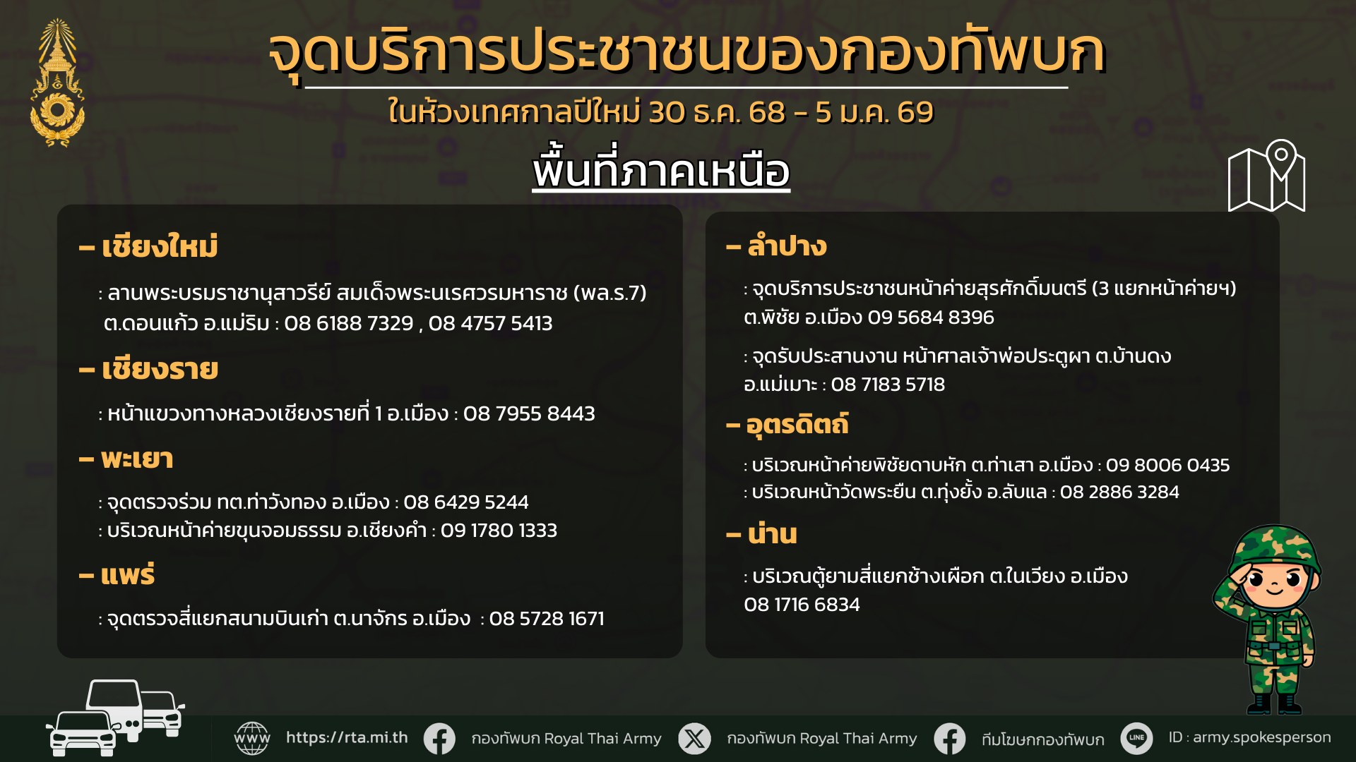 กองทัพบก ร่วมดูแลความปลอดภัยประชาชนช่วงเทศกาลปีใหม่ 2569 จัดตั้งจุดบริการประชาชนทั่วประเทศ โดยจัดตั้ง จุดบริการประชาชนจำนวน 82 จุด ครอบคลุมพื้นที่ทั่วประเทศระหว่างวันที่ 30 ธันวาคม 2568 ถึง 5 มกราคม 2569