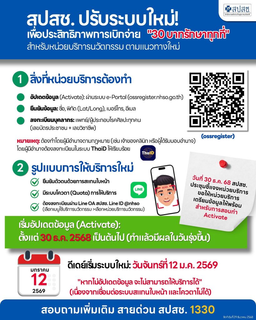 สปสช. ปรับระบบใหม่ เพื่อประสิทธิภาพการเบิกจ่าย “30 บาทรักษาทุกที่” สำหรับหน่วยบริการนวัตกรรมตามแนวทางใหม่ ดีเดย์เริ่มระบบใหม่ วันจันทร์ที่ 12 มกราคม 2569 หากไม่อัปเดตข้อมูล จะไม่สามารถให้บริการได้ (เนื่องจากเชื่อมต่อระบบสแกนใบหน้า และโควตาไม่ได้)
