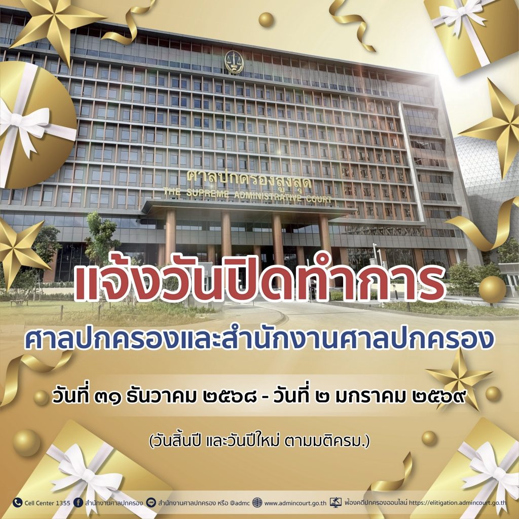 สำนักงานศาลปกครอง แจ้งปิดทำการในวันที่ 31 ธันวาคม 2568 – 2 มกราคม 2569 ข่าวสารกิจกรรม, ปีใหม่, เทศกาล สำนักงานศาลปกครอง แจ้งปิดทำการในวันที่ 31 ธันวาคม 2568 – 2 มกราคม 2569 ศาลปกครองและสำนักงานศาลปกครอง แจ้งปิดทำการในวันที่ 31 ธันวาคม 2568 – 2 มกราคม 2569(เนื่องในวันสิ้นปีและวันปีใหม่) ที่มา : Facebook สำนักงานศาลปกครอง Post Views: 15 FacebookFacebookXTwitterLINELine