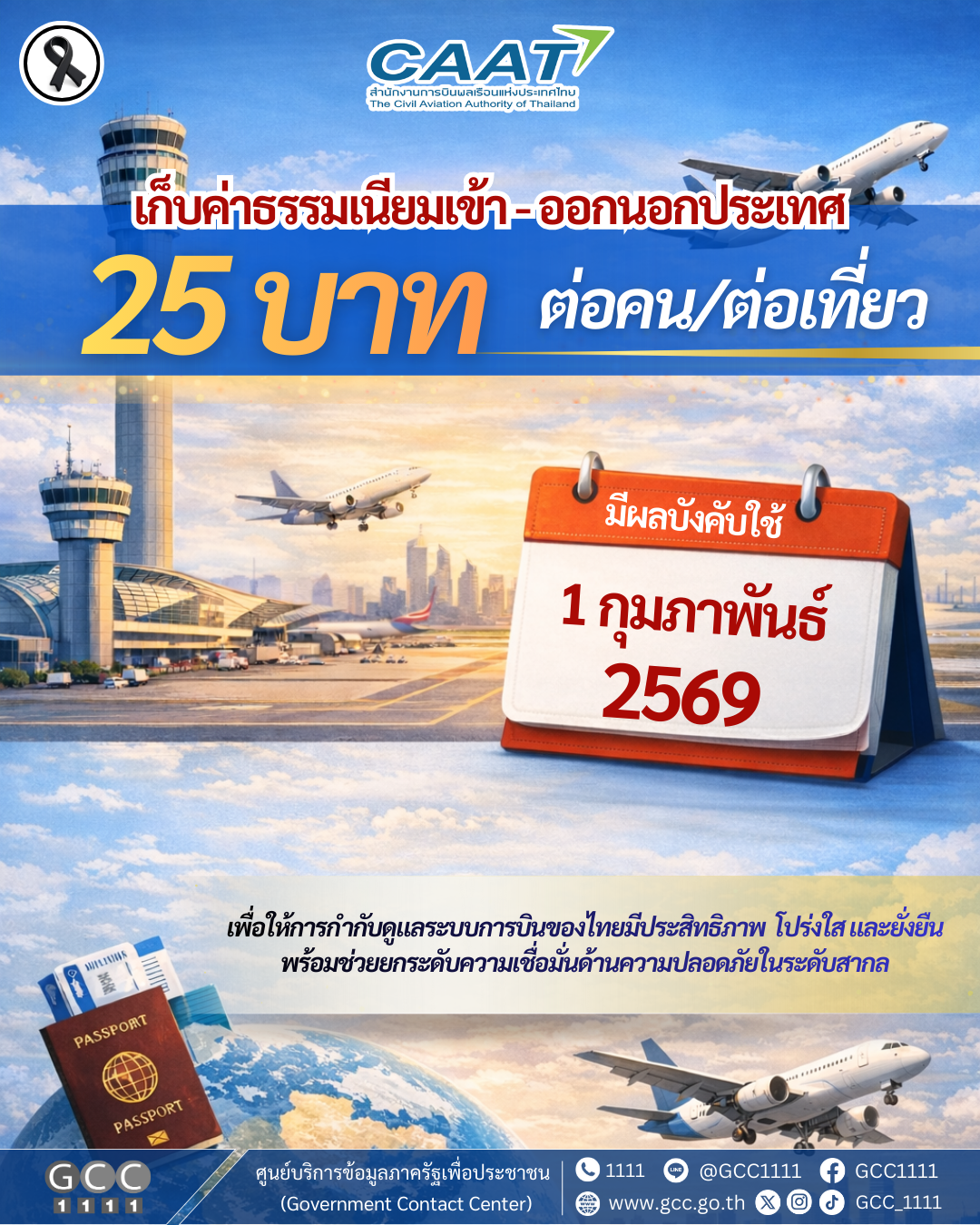 สำนักงานการบินพลเรือนแห่งประเทศไทย (กพท.) หรือ CAAT ออกประกาศกำหนดอัตรา ระยะเวลา และวิธีการนำส่งค่าธรรมเนียมการเข้าหรือออกนอกประเทศ ในอัตรา 25 บาทต่อผู้โดยสารหนึ่งคนต่อเที่ยว โดยจะเริ่มมีผลบังคับใช้ตั้งแต่วันที่ 1 กุมภาพันธ์ 2569 เป็นต้นไป