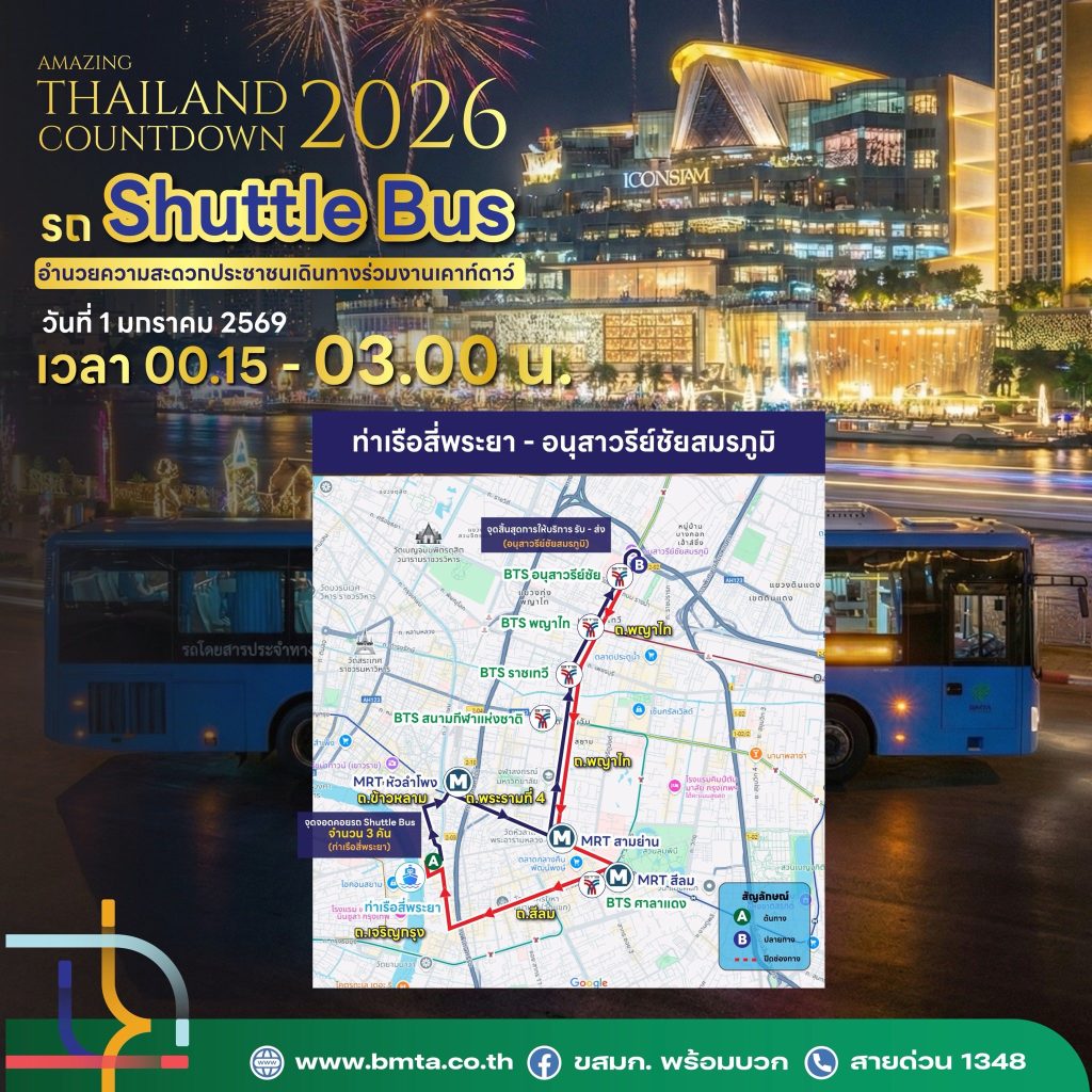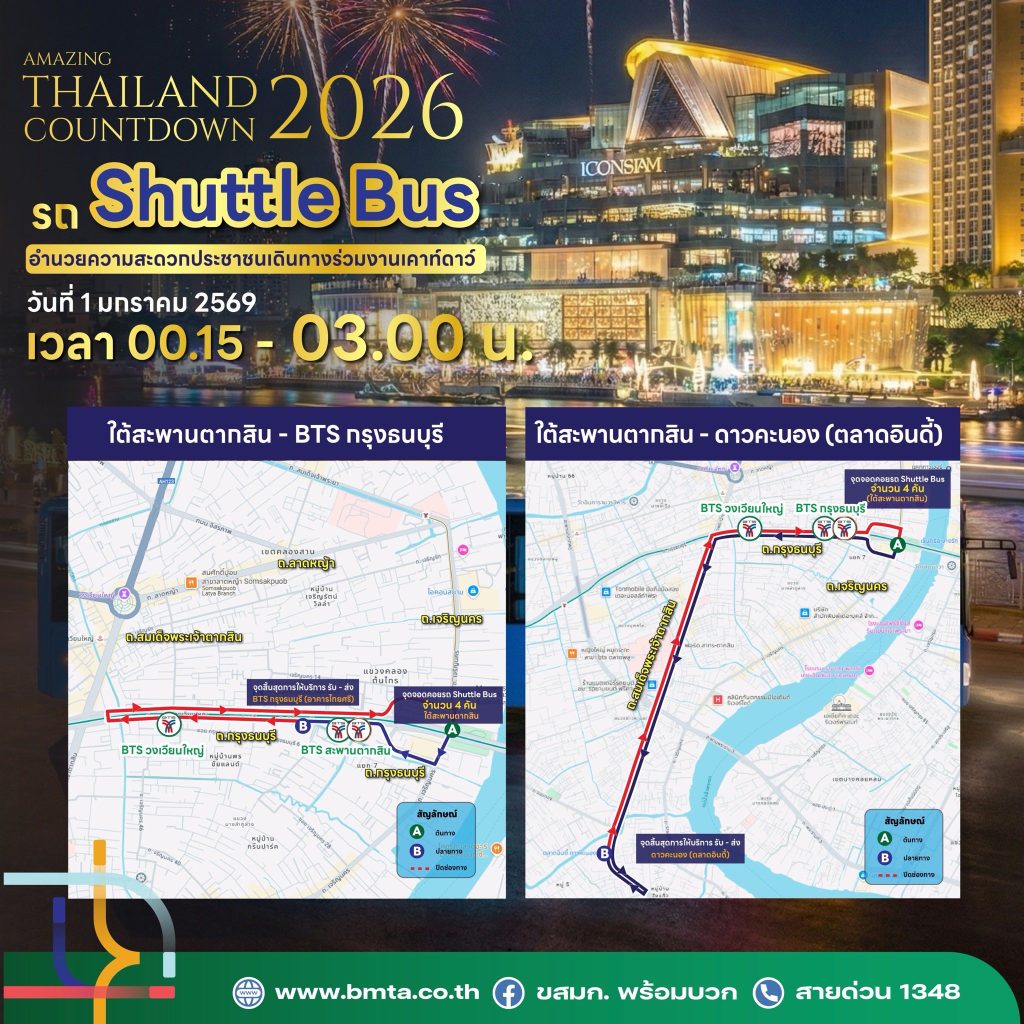 ขสมก. ร่วมกับ ICONSIAM จัด Shuttle Bus 5 เส้นทาง รับ-ส่งประชาชน คืนวันที่ 31 ธ.ค. – 1 ม.ค. 69 ข่าวสารกิจกรรม, ปีใหม่, เทศกาล ขสมก. ร่วมกับ ICONSIAM จัด Shuttle Bus 5 เส้นทาง รับ-ส่งประชาชน คืนวันที่ 31 ธ.ค. – 1 ม.ค. 69 องค์การขนส่งมวลชนกรุงเทพ ร่วมกับรถ Shuttle Bus รับ-ส่งประชาชนที่มาร่วมงาน Amazing Thailand Countdown 2026 ณ ไอคอนสยามให้บริการคืนวันที่ 31 ธันวาคม 2568 ต่อเช้าวันที่ 1 มกราคม 2569เวลาเดินรถ : 00.15 – 03.00 น.รวม 5 เส้นทาง เชื่อมต่อจุดสำคัญ ดังนี้ใต้สะพานตากสิน – BTS กรุงธนบุรี (หน้าอาคารไทยศรี)ใต้สะพานตากสิน – ดาวคะนอง (ตลาดอินดี้)ถนนลาดหญ้า – MRT จรัญฯ 13 (ฝั่งประตู 4)ถนนลาดหญ้า – อนุสาวรีย์ประชาธิปไตย (หน้า ร.ร.สตรีวิทย์)ท่าเรือสี่พระยา – อนุสาวรีย์ชัยสมรภูมิ (หน้าธนาคารออมสิน) ที่มา : Facebook ขสมก. พร้อมบวก Post Views: 31 FacebookFacebookXTwitterLINELine