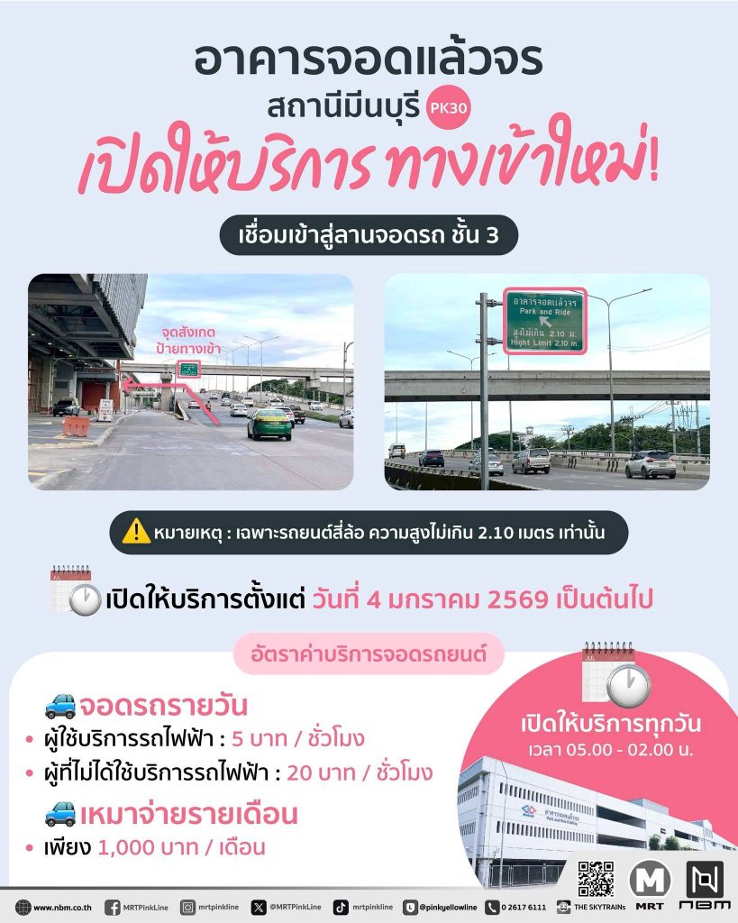 รถไฟฟ้ามหานคร สายสีชมพู แจ้งอาคารจอดแล้วจร สถานีมีนบุรี (PK30) เปิดให้บริการทางเข้าใหม่ เชื่อมเข้าสู่ลานจอดรถ ชั้น 3 เปิดให้บริการตั้งแต่วันที่ 4 มกราคม 2569 เป็นต้นไป เพื่ออำนวยความสะดวกให้ประชาชนจอดรถยนต์ และต่อรถไฟฟ้ามหานคร สายสีชมพูได้ง่ายยิ่งขึ้น
